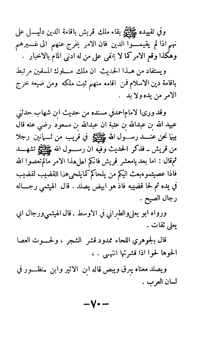 وقد روى الإمام أحمد في مسنده من حديث ابن شهاب حدثني عبيد الله بن عبد الله بن عتبة أن عبد الله بن مسعود رضي عنه قال: بينما نحن عند رسول الله - صلى الله عليه وسلم - في قريب من ثمانين رجلا من قريش, فذكر الحديث، وفيه أن رسول الله - صلى الله عليه وسلم - تشهد ثم قال: «أما بعد يا معشر قريش, فإنكم أهل هذا الأمر ما لم تعصوا الله, فإذا عصيتموه بعث إليكم من يلحاكم, كما يلحى هذا القضيب لقضيب في يده ثم لحا قضيبه, فإذا هو أبيض يصلد». قال الهيثمي: رجاله رجال الصحيح.