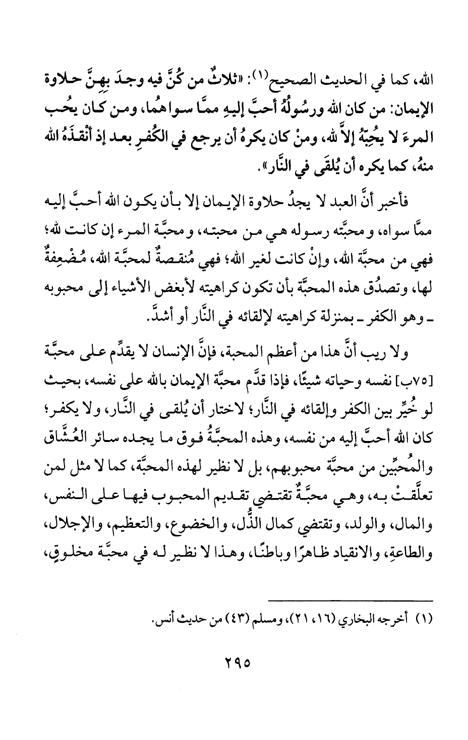 [75 ب] نفسه وحياته شيئا، فاذا قدم محبة الايمان بالله على نفسه، بحيث