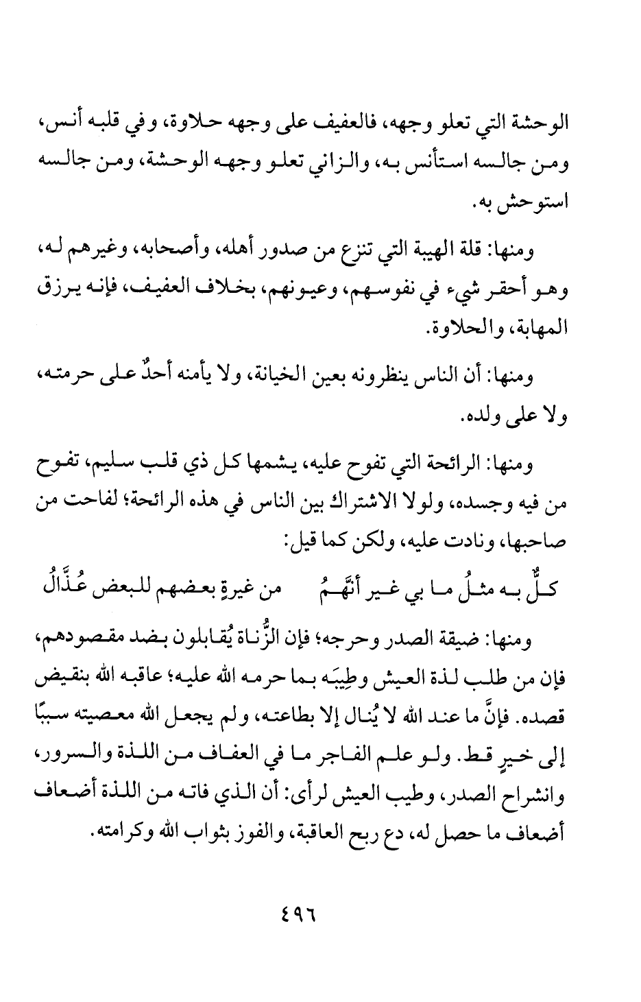 الوحشة التي تعلو وجهه، فالعفيف على وجهه حلاوة، وفي قلبه أنس،