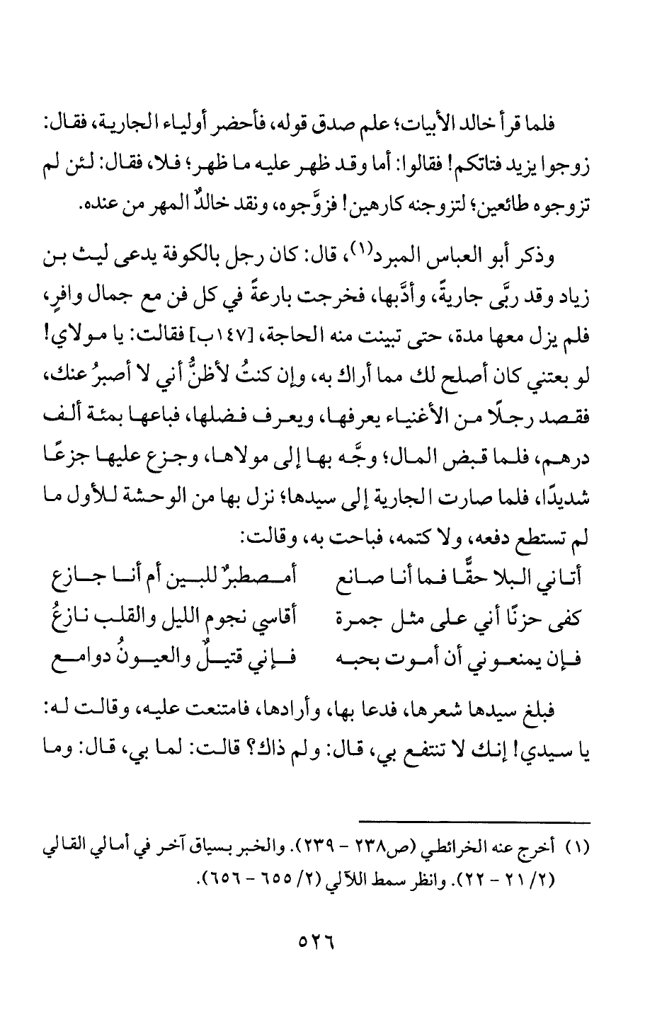فلما قرأ خالد الابيات؛ علم صدق قوله، فأحضر أولياء ا لجارية، فقال: