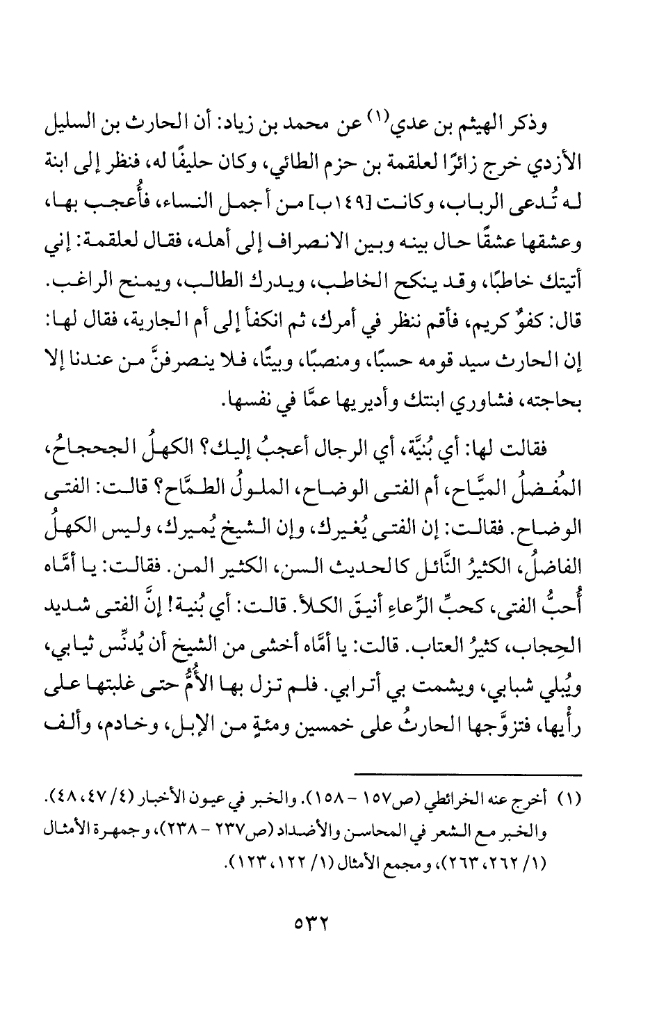 رأ يها، فتزوجها ا لحارث على خمسين ومئة من الابل، وخادم، و لف