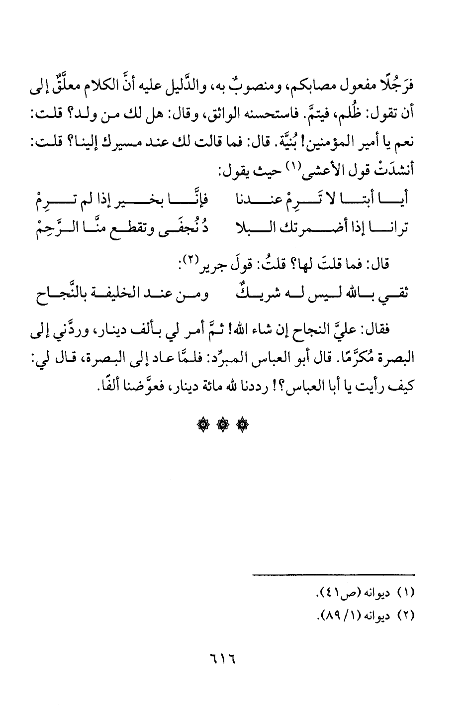 فقال: علي النجاج إن شاء الله! ثم أمر لي بألف دينار، وردني إ لى