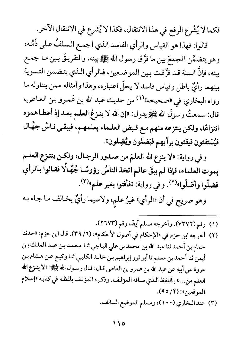 وفي رواية: " لا ينزع الله العلم من صدور الرجال، ولكن ينتزع العلم