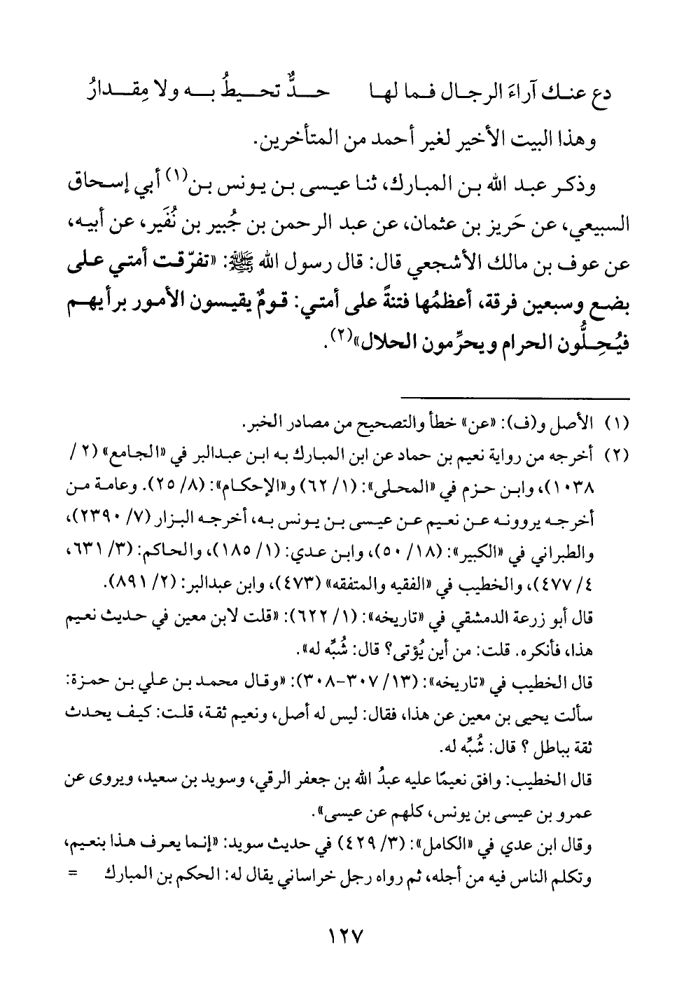 بضع وسبعين فرقة، أعظمها فتنة على أمتي: قوم يقيسون الأمور برأيهم