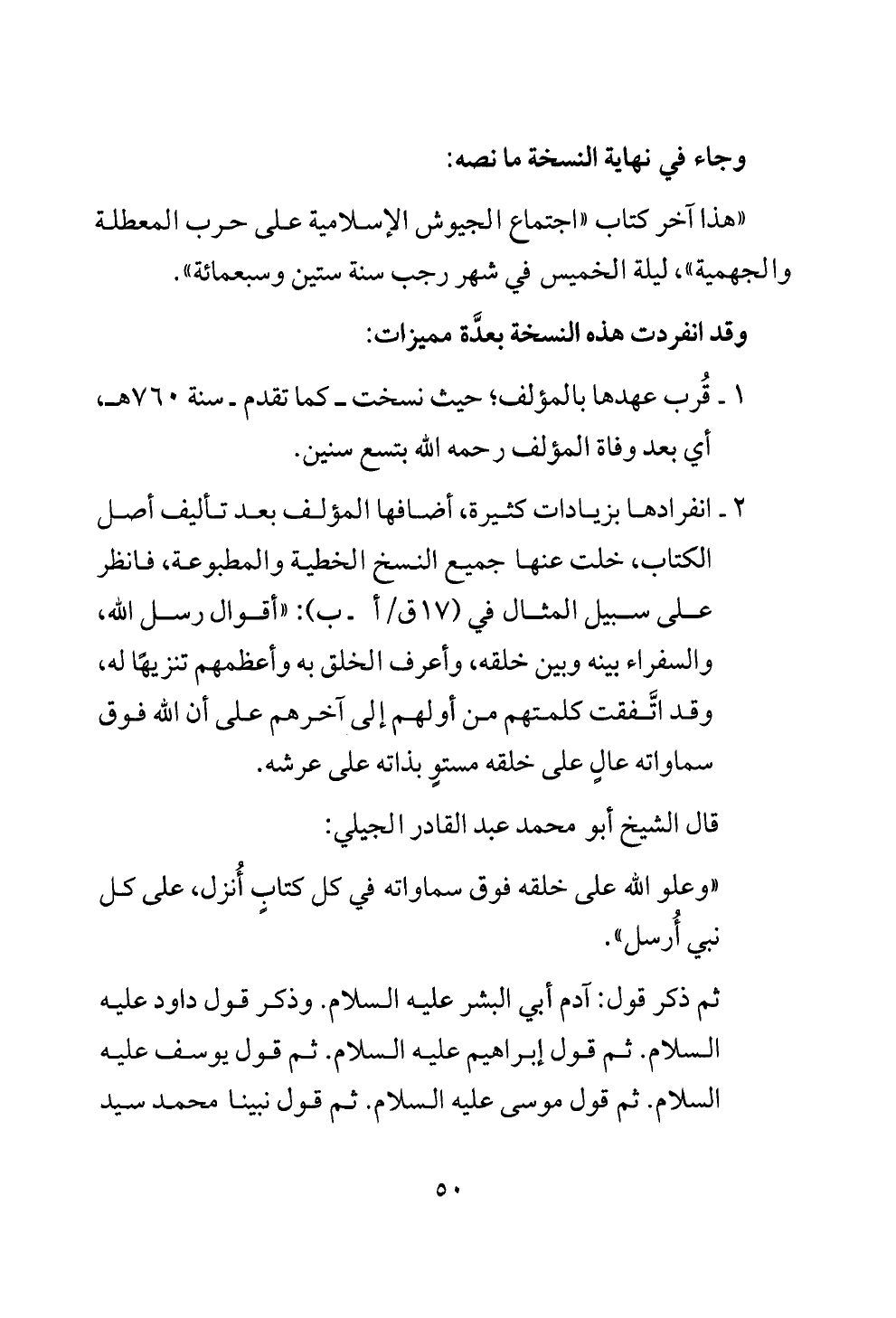 2 - انفرادها بزيادات كثيرة، أضافها المؤلف بعد تأليف أصل الكتاب، خلت عنها جميع النسخ الخطية والمطبوعة، فانظر على سبيل المثال في (17 ق/ أ- ب): "أقوال رسل الله، والسفراء بينه وبين خلقه، وأعرف الخلق به وأعظمهم تنزيهًا له، وقد اتَّفقت كلمتهم من أولهم إلى آخرهم على أن الله فوق سماواته عالٍ على خلقه مستوٍ بذاته على عرشه.