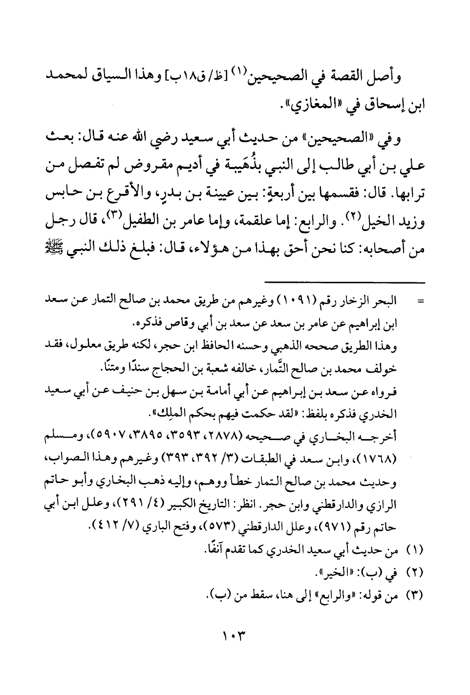 وفي "الصحيحين" من حديث أبي سعيد رضي الله عنه قال: بعث علي بن أبي طالب إلى النبي بذُهَيبة في أديم مقروض لم تفصل من ترابها. قال: فقسمها بين أربعةٍ: بين عيينة بن بدرٍ، والأقرع بن حابس وزيد الخيل (¬2). والرابع: إما علقمة، وإما عامر بن الطفيل (¬3)، قال رجل من أصحابه: كنا نحن أحق بهذا من هؤلاء، قال: فبلغ ذلك النبي - صلى الله عليه وسلم -