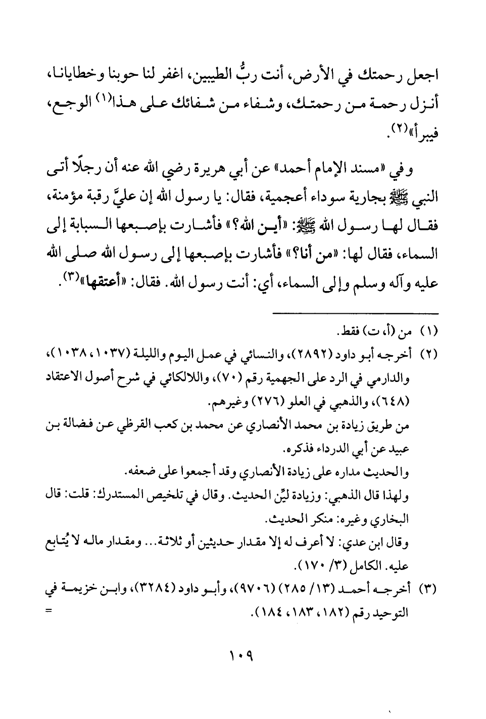 وفي "مسند الإمام أحمد" عن أبي هريرة رضي الله عنه أن رجلًا أتى النبي - صلى الله عليه وسلم - بجارية سوداء أعجمية، فقال: يا رسول الله إن عليَّ رقبة مؤمنة، فقال لها رسول الله - صلى الله عليه وسلم -: "أين الله؟ " فأشارت بإصبعها السبابة إلى السماء، فقال لها: "من أنا؟ " فأشارت بإصبعها إلى رسول الله صلى الله عليه وآله وسلم وإلى السماء، أي: أنت رسول الله. فقال: "أعتقها" (¬3).