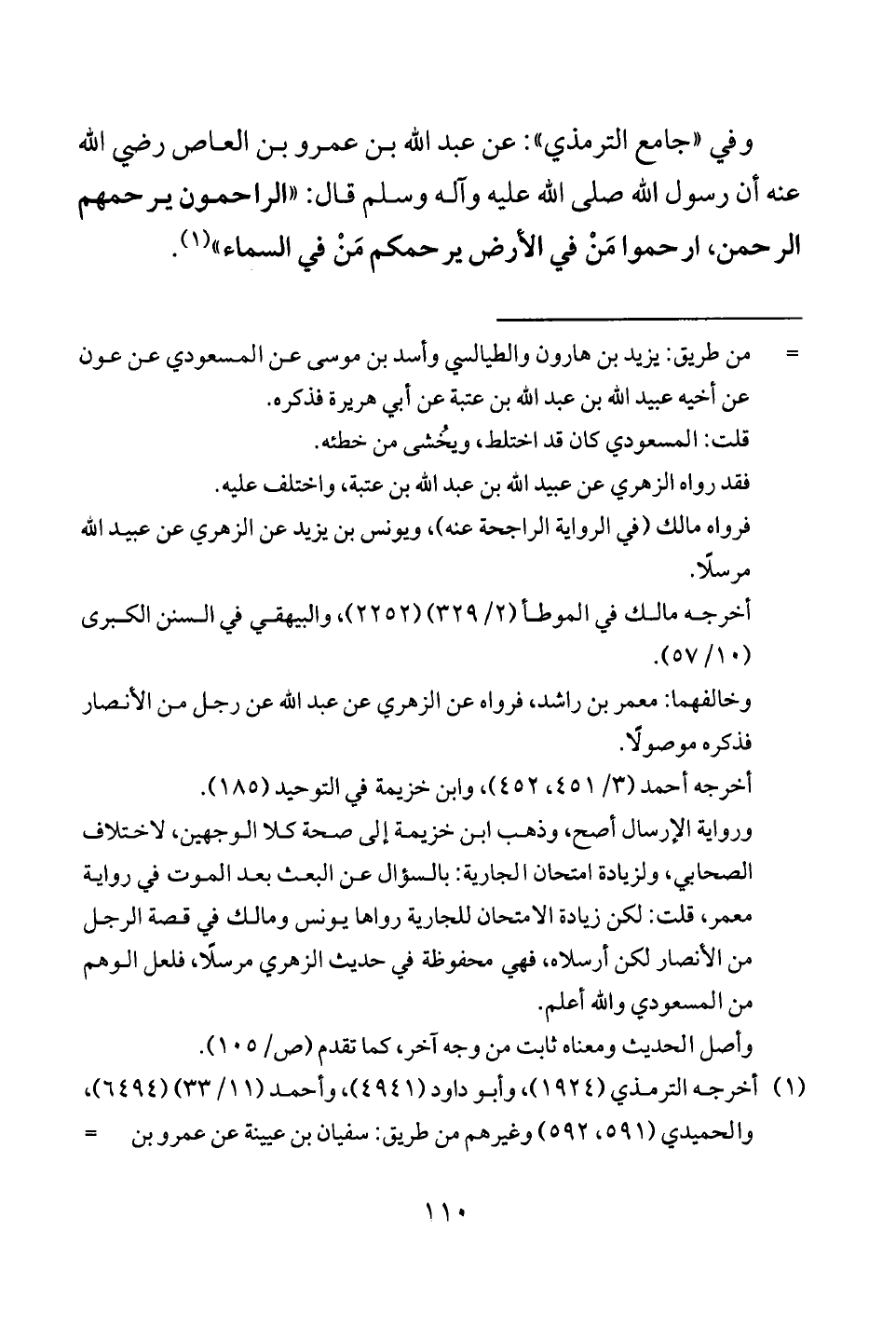 وفي "جامع الترمذي": عن عبد الله بن عمرو بن العاص رضي الله عنه أن رسول الله صلى الله عليه وآله وسلم قال: "الراحمون يرحمهم الرحمن، ارحموا مَنْ في الأرض يرحمكم مَنْ في السماء" (¬1).