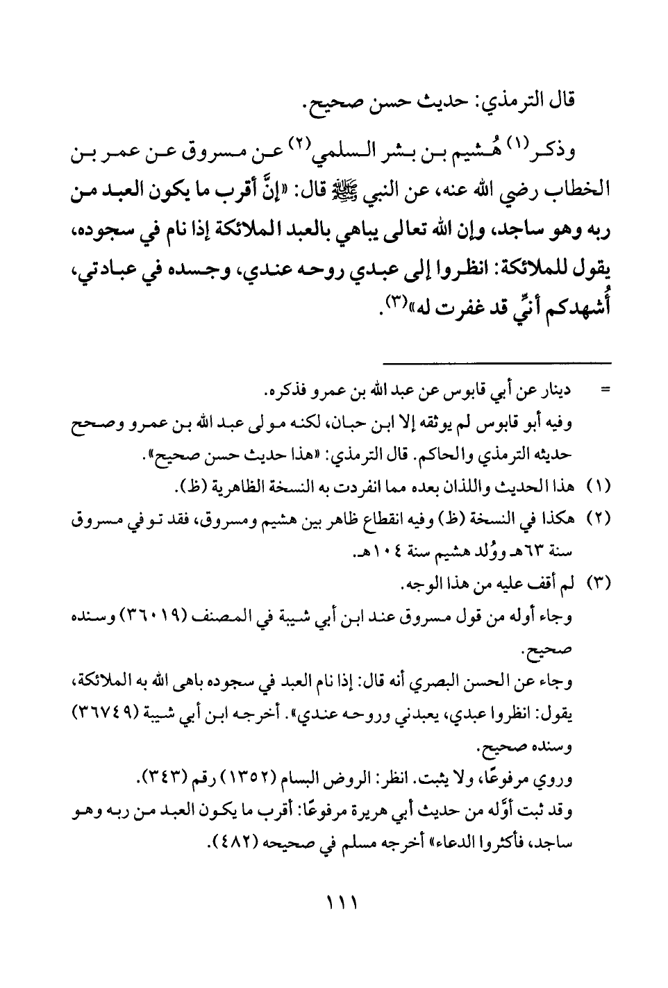 وذكر (¬1) هُشيم بن بشر السلمي (¬2) عن مسروق عن عمر بن الخطاب رضي الله عنه، عن النبي - صلى الله عليه وسلم - قال: "إنَّ أقرب ما يكون العبد من ربه وهو ساجد، وإن الله تعالى يباهي بالعبد الملائكة إذا نام في سجوده، يقول للملائكة: انظروا إلى عبدي روحه عندي، وجسده في عبادتي، أُشهدكم أنِّي قد غفرت له" (¬3).