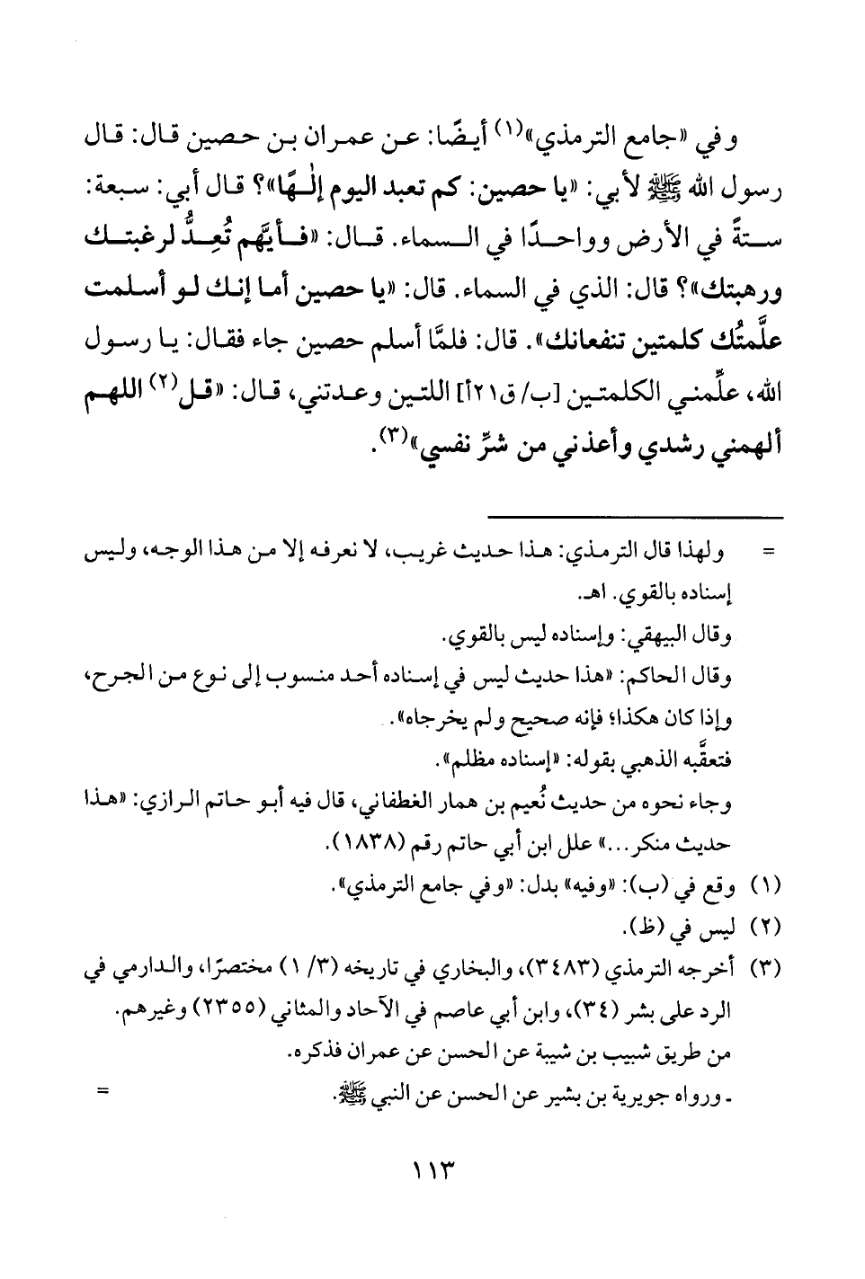 وفي "جامع الترمذي" (¬1) أيضًا: عن عمران بن حصين قال: قال رسول الله - صلى الله عليه وسلم - لأبي: "يا حصين: كم تعبد اليوم إلهًا"؟ قال أبي: سبعة: ستةً في الأرض وواحدًا في السماء. قال: "فأيَّهم تُعِدُّ لرغبتك ورهبتك"؟ قال: الذي في السماء. قال: "يا حصين أما إنك لو أسلمت علَّمتُك كلمتين تنفعانك". قال: فلمَّا أسلم حصين جاء فقال: يا رسول الله، علِّمني الكلمتين [ب/ ق 21 أ] اللتين وعدتني، قال: "قل (¬2) اللهم ألهمني رشدي وأعذني من شرِّ نفسي" (¬3).