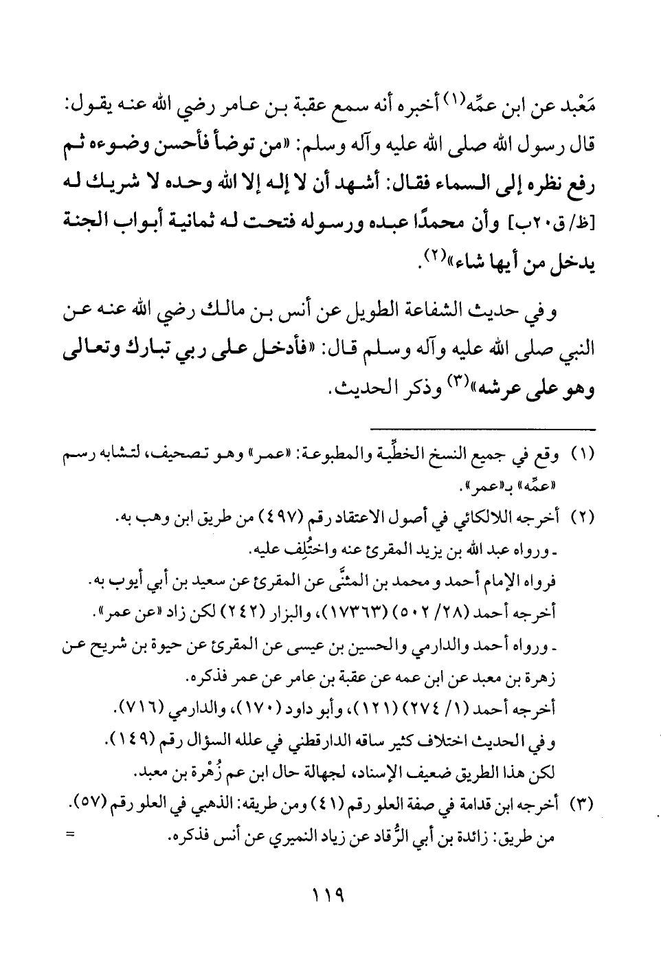 (¬3) أخرجه ابن قدامة في صفة العلو رقم (41) ومن طريقه: الذهبي في العلو رقم (57). من طريق: زائدة بن أبي الرُّقاد عن زياد النميري عن أنس فذكره. =