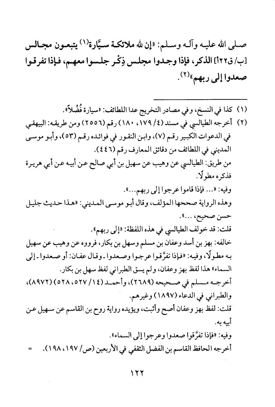 صلى الله عليه وآله وسلم: "إن لله ملائكة سيَّارة (¬1) يتبعون مجالس [ب/ ق 22 أ] الذكر، فإذا وجدوا مجلس ذِكْر جلسوا معهم، فإذا تفرقوا صعدوا إلى ربهم" (¬2).