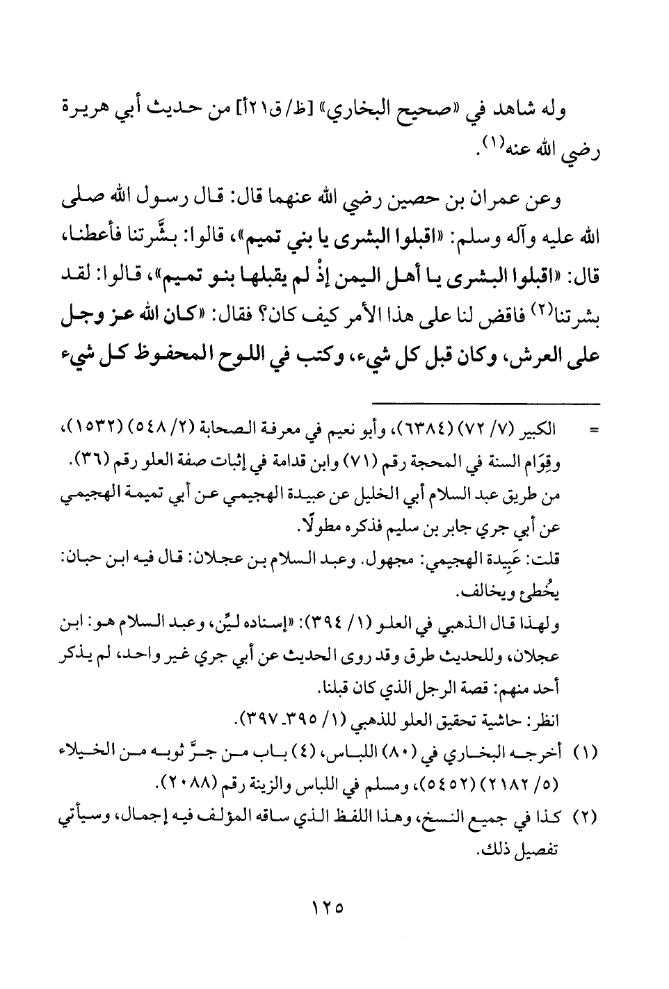 وعن عمران بن حصين رضي الله عنهما قال: قال رسول الله صلى الله عليه وآله وسلم: "اقبلوا البشرى يا بني تميم"، قالوا: بشَّرتنا فأعطنا، قال: "اقبلوا البشرى يا أهل اليمن إذْ لم يقبلها بنو تميم"، قالوا: لقد بشرتنا (¬2) فاقض لنا على هذا الأمر كيف كان؟ فقال: "كان الله عز وجل على العرش، وكان قبل كل شيء، وكتب في اللوح المحفوظ كل شيء