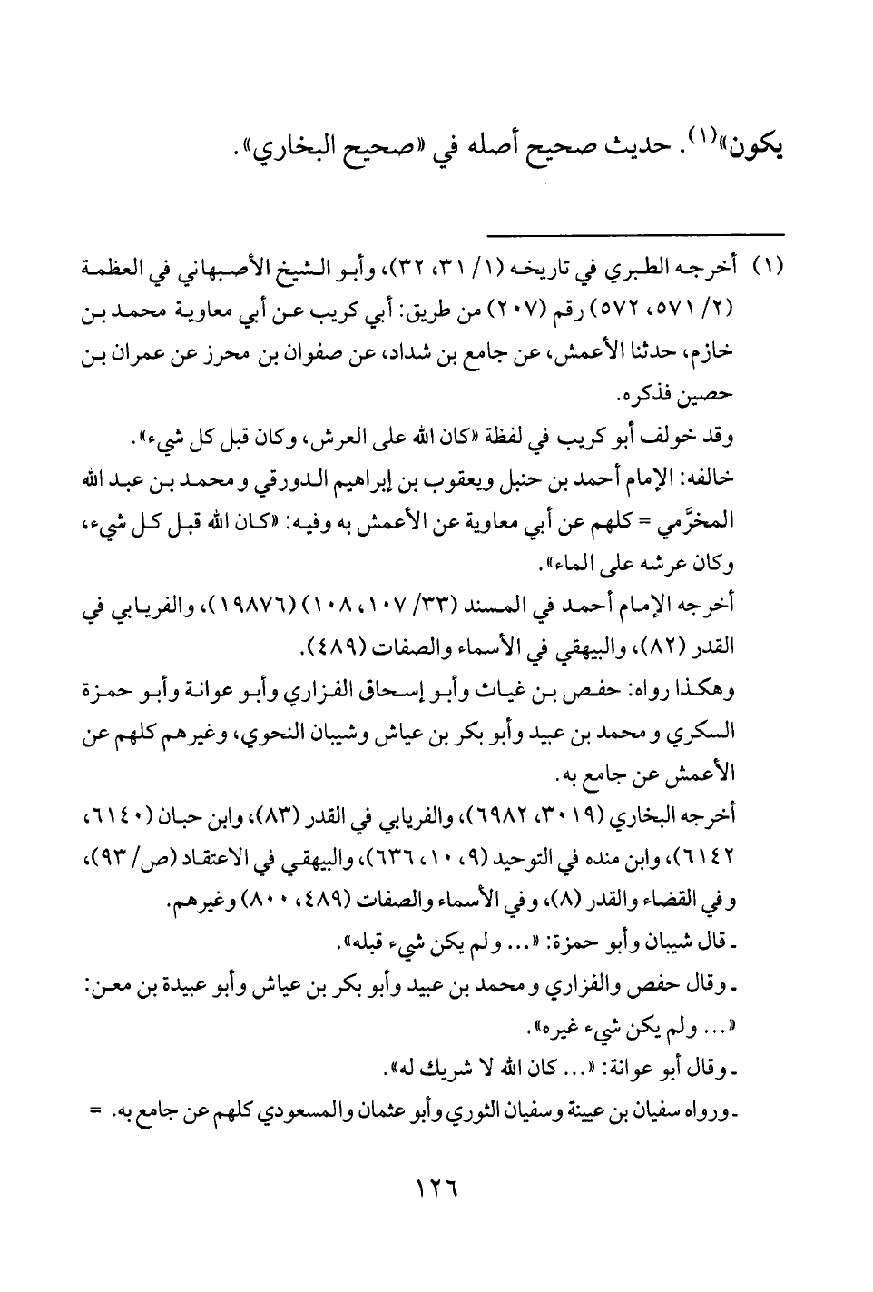 خالفه: الإمام أحمد بن حنبل ويعقوب بن إبراهيم الدورقي ومحمد بن عبد الله المخرَّمي = كلهم عن أبي معاوية عن الأعمش به وفيه: "كان الله قبل كل شيء، وكان عرشه على الماء".
