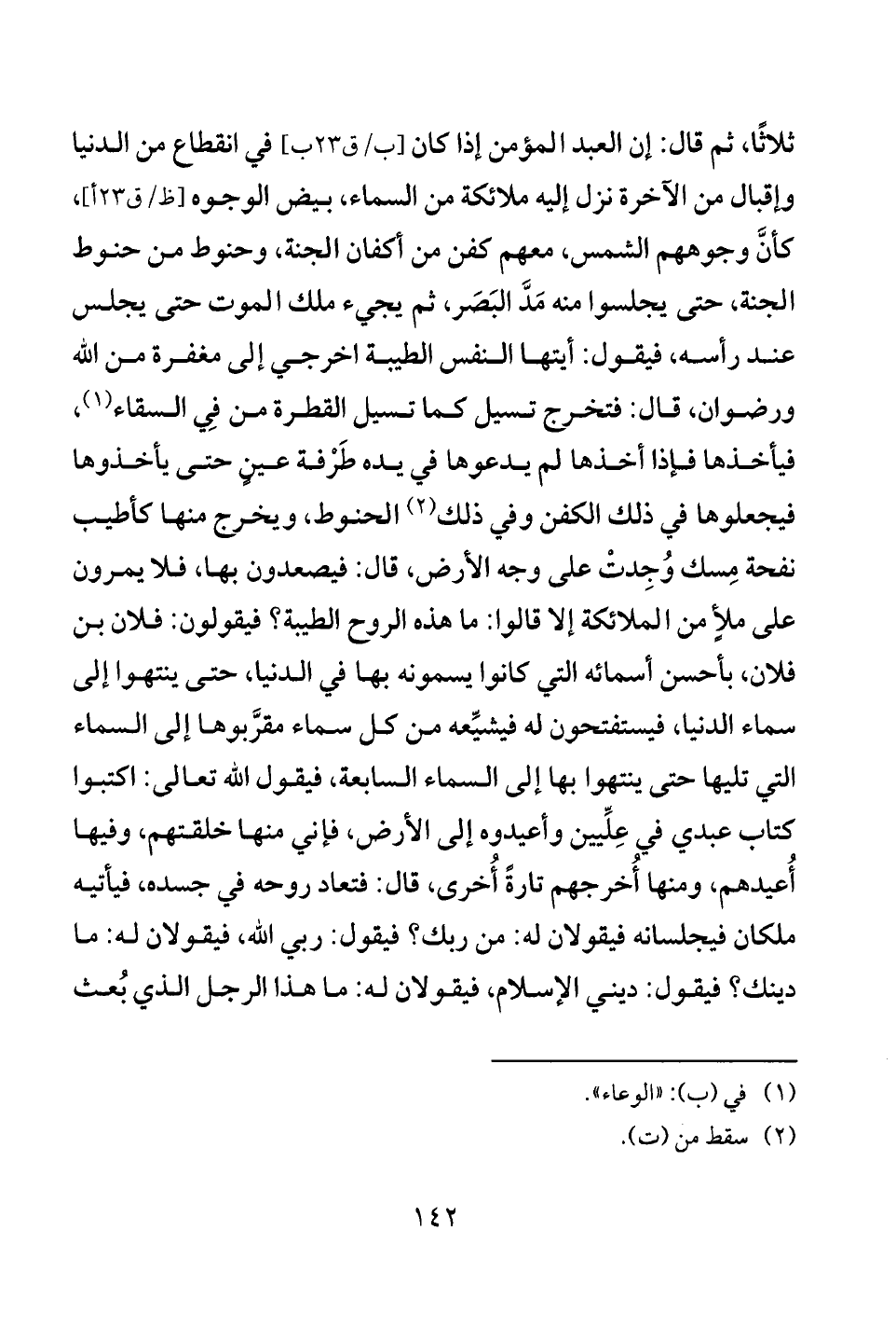 ثلاثًا، ثم قال: إن العبد المؤمن إذا كان [ب/ ق 23 ب] في انقطاع من الدنيا وإقبال من الآخرة نزل إليه ملائكة من السماء، بيض الوجوه [ظ/ ق 23 أ]، كأنَّ وجوههم الشمس، معهم كفن من أكفان الجنة، وحنوط من حنوط الجنة، حتى يجلسوا منه مَدَّ البَصَر، ثم يجيء ملك الموت حتى يجلس عند رأسه، فيقول: أيتها النفس الطيبة اخرجي إلى مغفرة من الله ورضوان، قال: فتخرج تسيل كما تسيل القطرة من فِي السقاء (¬1)، فيأخذها فإذا أخذها لم يدعوها في يده طَرْفة عينٍ حتى يأخذوها فيجعلوها في ذلك الكفن وفي ذلك (¬2) الحنوط، ويخرج منها كأطيب نفحة مِسك وُجِدتْ على وجه الأرض، قال: فيصعدون بها، فلا يمرون على ملأٍ من الملائكة إلا قالوا: ما هذه الروح الطيبة؟ فيقولون: فلان بن فلان، بأحسن أسمائه التي كانوا يسمونه بها في الدنيا، حتى ينتهوا إلى سماء الدنيا، فيستفتحون له فيشيِّعه من كل سماء مقرَّبوها إلى السماء التي تليها حتى ينتهوا بها إلى السماء السابعة، فيقول الله تعالى: اكتبوا كتاب عبدي في عِلِّيين وأعيدوه إلى الأرض، فإني منها خلقتهم، وفيها أُعيدهم، ومنها أُخرجهم تارةً أُخرى، قال: فتعاد روحه في جسده، فيأتيه ملكان فيجلسانه فيقولان له: من ربك؟ فيقول: ربي الله، فيقولان له: ما دينك؟ فيقول: ديني الإسلام، فيقولان له: ما هذا الرجل الذي بُعث
