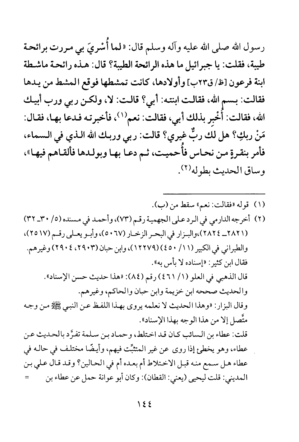 (¬2) أخرجه الدارمي في الرد على الجهمية رقم (73)، وأحمد في مسنده (5/ 30 - 32) (2821 - 2824)، والبزار في البحر الزخار (5067)، وأبو يعلى رقم (2517)، والطبراني في الكبير (11/ 450) (12279)، وابن حبان (2903، 2904) وغيرهم. فقال ابن كثير: "إسناده لا بأس به".