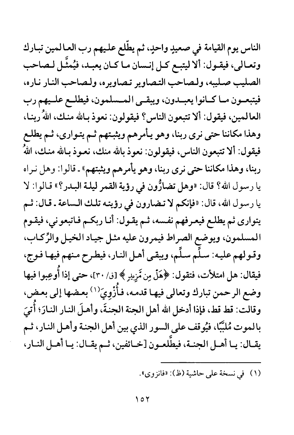 الناس يوم القيامة في صعيدٍ واحدٍ، ثم يطّلع عليهم رب العالمين تبارك وتعالى، فيقول: ألا ليتبع كل إنسان ما كان يعبد، فيُمثَّل لصاحب الصليب صليبه، ولصاحب التصاوير تصاويره، ولصاحب النار ناره، فيتبعون ما كانوا يعبدون، ويبقى المسلمون، فيطلع عليهم رب العالمين، فيقول: ألا تتبعون الناس؟ فيقولون: نعوذ بالله منك، اللهُ ربنا، وهذا مكاننا حتى نرى ربنا، وهو يأمرهم ويثبتهم ثم يتوارى، ثم يطلع فيقول: ألا تتبعون الناس، فيقولون: نعوذ بالله منك، نعوذ بالله منك، اللهُ ربنا، وهذا مكاننا حتى نرى ربنا، وهو يأمرهم ويثبتهم" - قالوا: وهل نراه يا رسول الله؟ قال: "وهل تضارُّون في رؤية القمر ليلة البدر؟ " قالوا: لا يا رسول الله، قال: "فإنكم لا تضارون في رؤيته تلك الساعة - قال: ثم يتوارى ثم يطلع فيعرفهم نفسه، ثم يقول: أنا ربكم فاتبعوني، فيقوم المسلمون، ويوضع الصراط فيمرون عليه مثل جياد الخيل والرِّكاب، وقولهم عليه: سلِّم سلِّم، ويبقى أهل النار، فيطرح منهم فيها فوج، فيقال: هل امتلأت، فتقول: {هَلْ مِنْ مَزِيدٍ} [ق: 30] , حتى إذا أُوعِبوا فيها وضع الرحمن تبارك وتعالى فيها قدمه، فأُزْوِيَ (¬1) بعضها إلى بعض، وقالت: قط قط، فإذا أدخل الله أهل الجنة الجنةَ، وأهلَ النار النارَ؛ أُتيَ بالموت مُلبَّبًا، فيُوقف على السور الذي بين أهل الجنة وأهل النار، ثم يقال: يا أهل الجنة، فيطَّلعون [خائفين، ثم يقال: يا أهل النار،