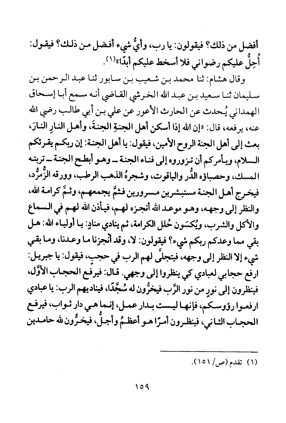 وقال هشام: ثنا محمد بن شعيب بن سابور ثنا عبد الرحمن بن سليمان ثنا سعيد بن عبد الله الخرشي القاضي أنه سمع أبا إسحاق الهمداني يُحدث عن الحارث الأعور عن علي بن أبي طالب رضي الله عنه، يرفعه، قال: "إن الله إذا أسكن أهل الجنةِ الجنةَ، وأهل النارِ النارَ، بعث إلى أهل الجنة الروح الأمين، فيقول: يا أهل الجنة: إن ربكم يقرئكم السلام، ويأمركم أن تزوروه إلى فناء الجنة- وهو أبطح الجنة- تربته المسك، وحصباؤه الدُّر والياقوت، وشجرهُ الذهب الرطب، وورقه الزُّمرُّد، فيخرج أهل الجنة مستبشرين مسرورين فثمَّ يجمعهم، وثمَّ كرامة الله، والنظر إلى وجهه، وهو موعد الله أنجزه لهم، فيأذن الله لهم في السماع والأكل والشرب، وُيكسَون حُلل الكرامة، ثم ينادي منادٍ: يا أولياء الله: هل بقي مما وعدكم ربكم شيء؟ فيقولون: لا، وقد أنجزنا ما وعدنا، وما بقي شيء إلا النظر إلى وجهه، فيتجلَّى لهم الرب في حجبٍ، فيقول: يا جبريل: ارفع حجابي لعبادي كى ينظروا إلى وجهي. قال: فيرفع الحجاب الأوَّل، فينظرون إلى نورٍ من نور الرَّب فيخرُّون له سُجَّدًا، فيناديهم الرب: يا عبادي ارفعوا رؤوسكم، فإنها ليست بدار عمل، إنما هي دار ثواب، فيرفع الحجاب الثاني، فينظرون أمرًا هو أعظمُ وأجلُّ، فيخرُّون لله حامدين