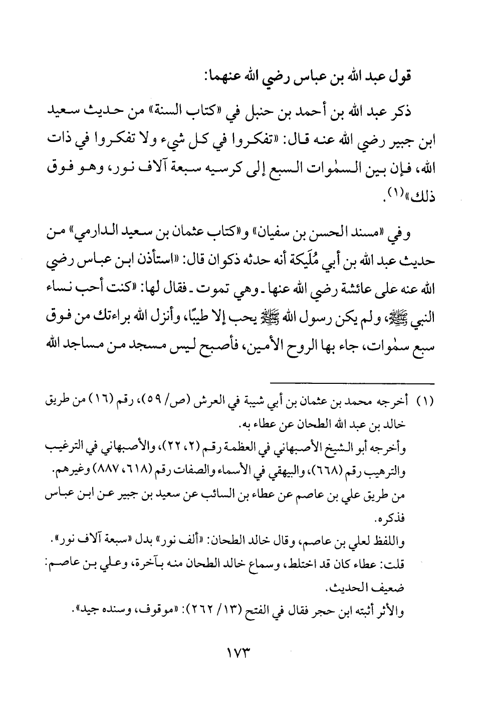 ذكر عبد الله بن أحمد بن حنبل في "كتاب السنة" من حديث سعيد ابن جبير رضي الله عنه قال: "تفكروا في كل شيء ولا تفكروا في ذات الله، فإن بين السموات السبع إلى كرسيه سبعة آلاف نور، وهو فوق ذلك " (¬1).