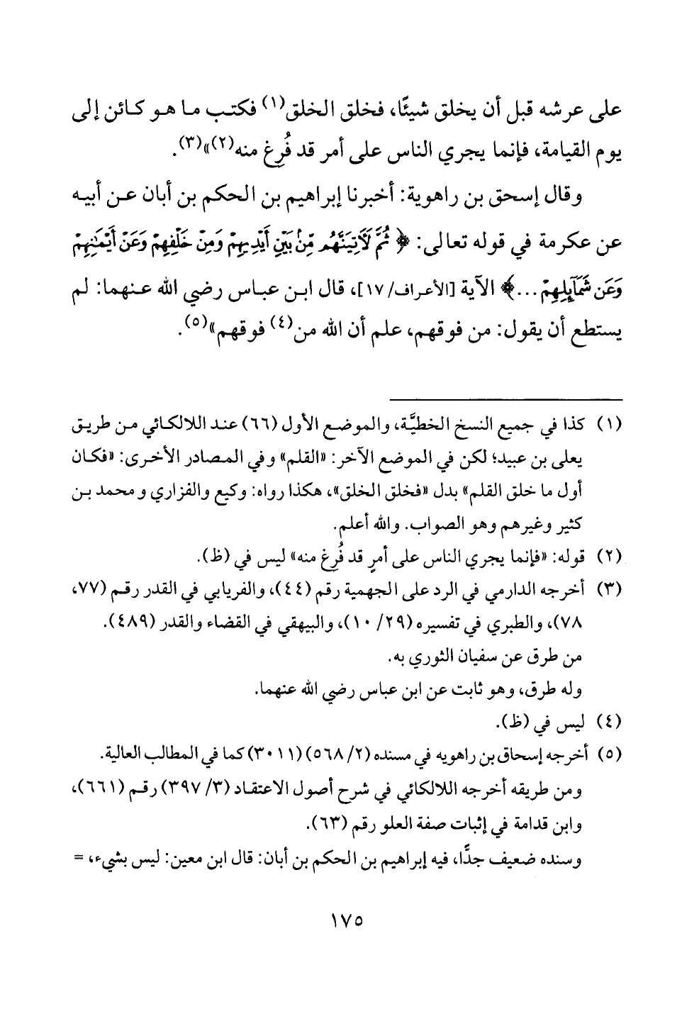 (¬1) كذا في جميع النسخ الخطيَّة، والموضع الأول (66) عند اللالكائي من طريق يعلى بن عبيد؛ لكن في الموضع الآخر: "القلم" وفي المصادر الأخرى: "فكان أول ما خلق القلم" بدل "فخلق الخلق"، هكذا رواه: وكيع والفزاري ومحمد بن كثير وغيرهم وهو الصواب. والله أعلم.