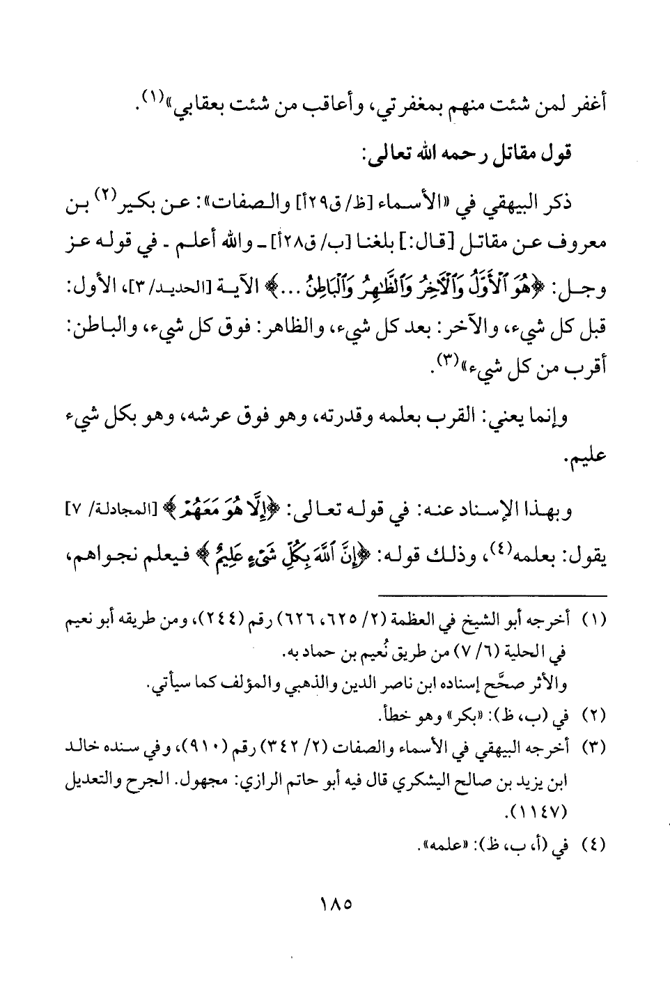 (¬3) أخرجه البيهقي في الأسماء والصفات (2/ 342) رقم (910)، وفي سنده خالد ابن يزيد بن صالح اليشكري قال فيه أبو حاتم الرازي: مجهول. الجرح والتعديل (1147).