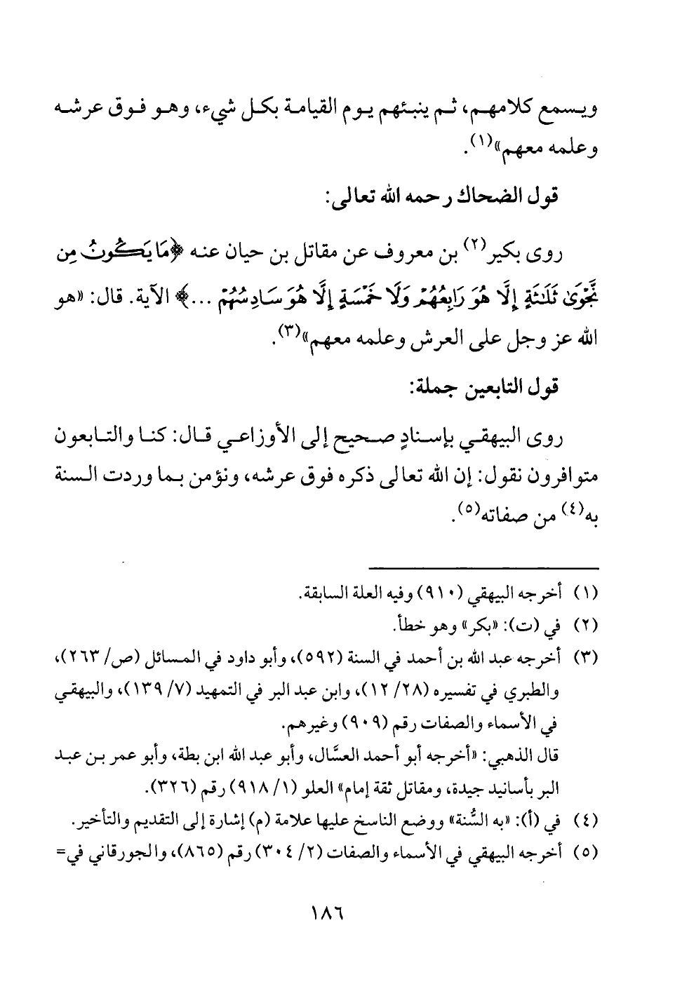 (¬3) أخرجه عبد الله بن أحمد في السنة (592)، وأبو داود في المسائل (ص/ 263)، والطبري في تفسيره (28/ 12)، وابن عبد البر في التمهيد (7/ 139)، والبيهقي في الأسماء والصفات رقم (909) وغيرهم.