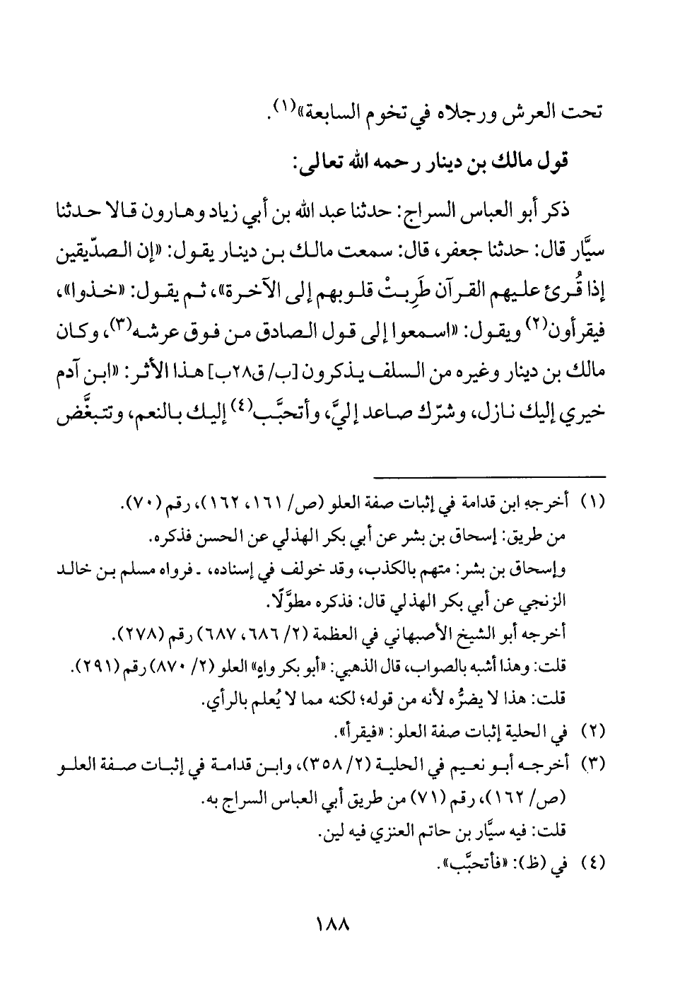(¬3) أخرجه أبو نعيم في الحلية (2/ 358)، وابن قدامة في إثبات صفة العلو (ص/ 162)، رقم (71) من طريق أبي العباس السراج به.