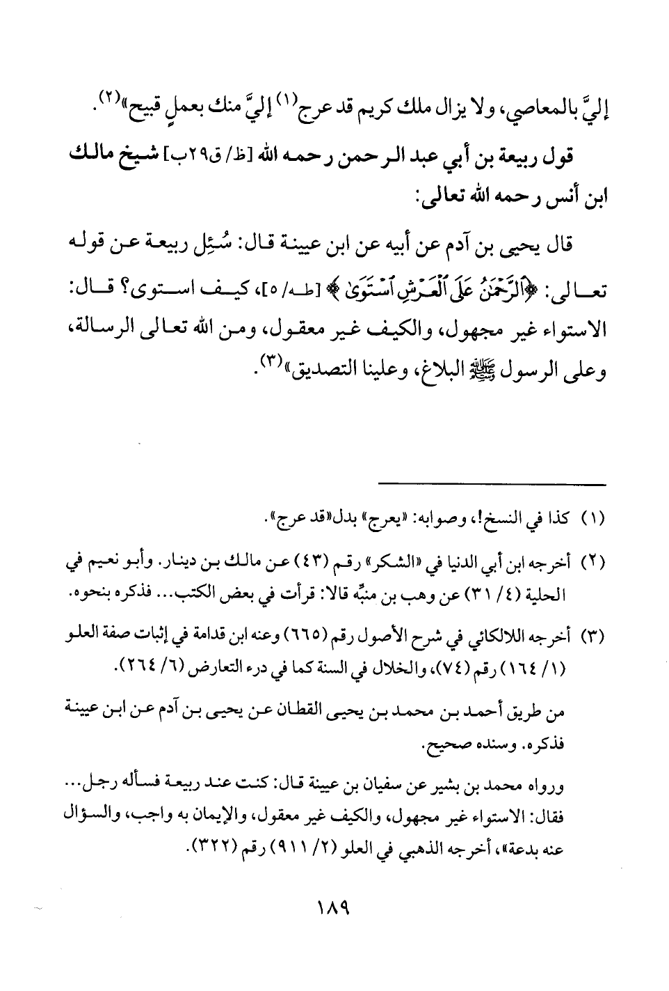 (¬3) أخرجه اللالكائي في شرح الأصول رقم (665) وعنه ابن قدامة في إثبات صفة العلو (1/ 164) رقم (74)، والخلال في السنة كما في درء التعارض (6/ 264).