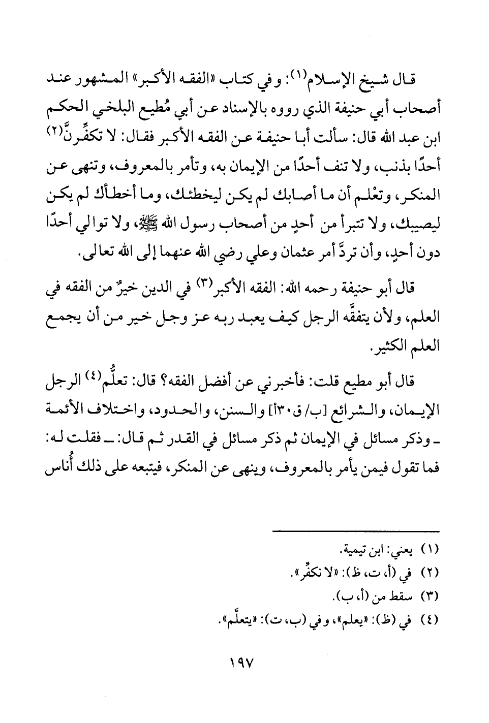 قال شيخ الإسلام (¬1): وفي كتاب "الفقه الأكبر" المشهور عند أصحاب أبي حنيفة الذي رووه بالإسناد عن أبي مُطيع البلخي الحكم ابن عبد الله قال: سألت أبا حنيفة عن الفقه الأكبر فقال: لا تكفِّرنَّ (¬2) أحدًا بذنب، ولا تنف أحدًا من الإيمان به، وتأمر بالمعروف، وتنهى عن المنكر، وتعْلم أن ما أصابك لم يكن ليخطئك، وما أخطأك لم يكن ليصيبك، ولا تتبرأ من أحدٍ من أصحاب رسول الله - صلى الله عليه وسلم -، ولا توالي أحدًا دون أحدٍ، وأن تردَّ أمر عثمان وعلي رضي الله عنهما إلى الله تعالى.