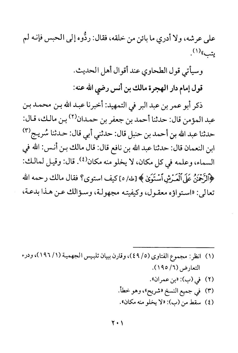 {الرَّحْمَنُ عَلَى الْعَرْشِ اسْتَوَى} [طه: 5] كيف استوى؟ فقال مالك رحمه الله تعالى: "استواؤه معقول، وكيفيته مجهولة، وسؤالك عن هذا بدعة،