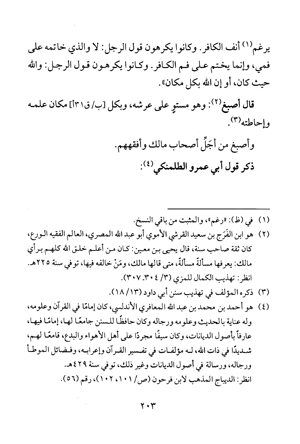 (¬4) هو أحمد بن محمد بن عبد الله المعافري الأندلسي، كان إمامًا في القرآن وعلومه، وله عناية بالحديث وعلومه ورجاله وكان حافظًا للسنن جامعًا لها، إمامًا فيها، عارفًا بأصول الديانات، وكان سيفًا مجردًا على أهل الأهواء والبدع، قامعًا لهم، شديدًا في ذات الله، له مؤلفات في تفسير القرآن وإعرابه، وفضائل الموطأ ورجاله، ورسالة في أصول الديانات وغير ذلك، توفي سنة 429 هـ.