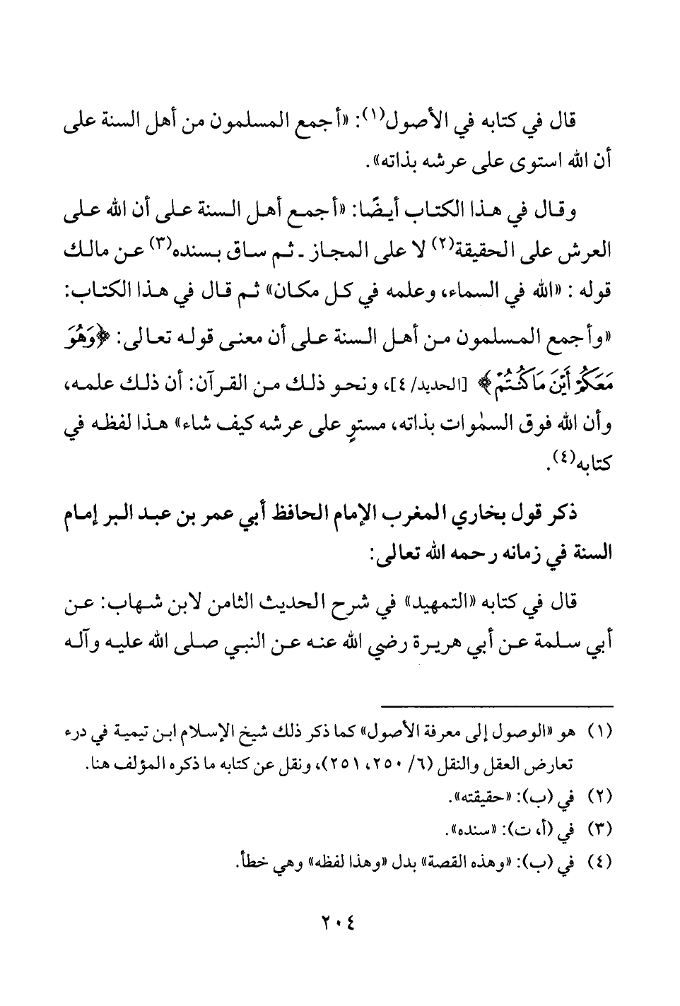 وقال في هذا الكتاب أيضًا: "أجمع أهل السنة على أن الله على العرش على الحقيقة (¬2) لا على المجاز - ثم ساق بسنده (¬3) عن مالك قوله: "الله في السماء، وعلمه في كل مكان" ثم قال في هذا الكتاب: "وأجمع المسلمون من أهل السنة على أن معنى قوله تعالى: {وَهُوَ مَعَكُمْ أَيْنَ مَا كُنْتُمْ} [الحديد: 4]، ونحو ذلك من القرآن: أن ذلك علمه، وأن الله فوق السماوات بذاته، مستوٍ على عرشه كيف شاء" هذا لفظه في كتابه (¬4).