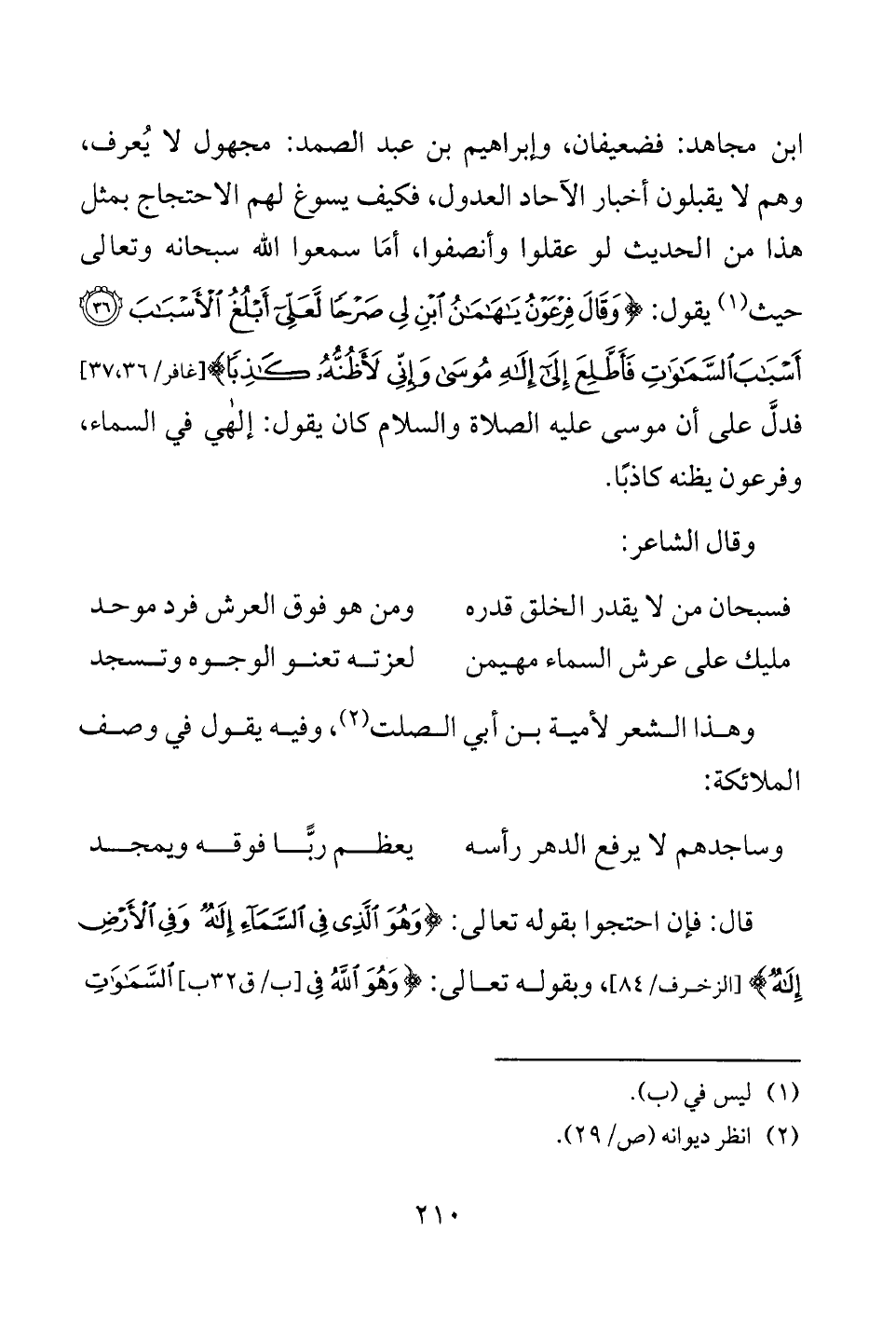 ابن مجاهد: فضعيفان، وإبراهيم بن عبد الصمد: مجهول لا يُعرف، وهم لا يقبلون أخبار الآحاد العدول، فكيف يسوغ لهم الاحتجاج بمثل هذا من الحديث لو عقلوا وأنصفوا، أمَا سمعوا الله سبحانه وتعالى حيث (¬1) يقول: {وَقَالَ فِرْعَوْنُ يَاهَامَانُ ابْنِ لِي صَرْحًا لَعَلِّي أَبْلُغُ الْأَسْبَابَ (36) أَسْبَابَ السَّمَاوَاتِ فَأَطَّلِعَ إِلَى إِلَهِ مُوسَى وَإِنِّي لَأَظُنُّهُ كَاذِبًا} [غافر: 36 - 37] فدلَّ على أن موسى عليه الصلاة والسلام كان يقول: إلهى في السماء، وفرعون يظنه كاذبًا.