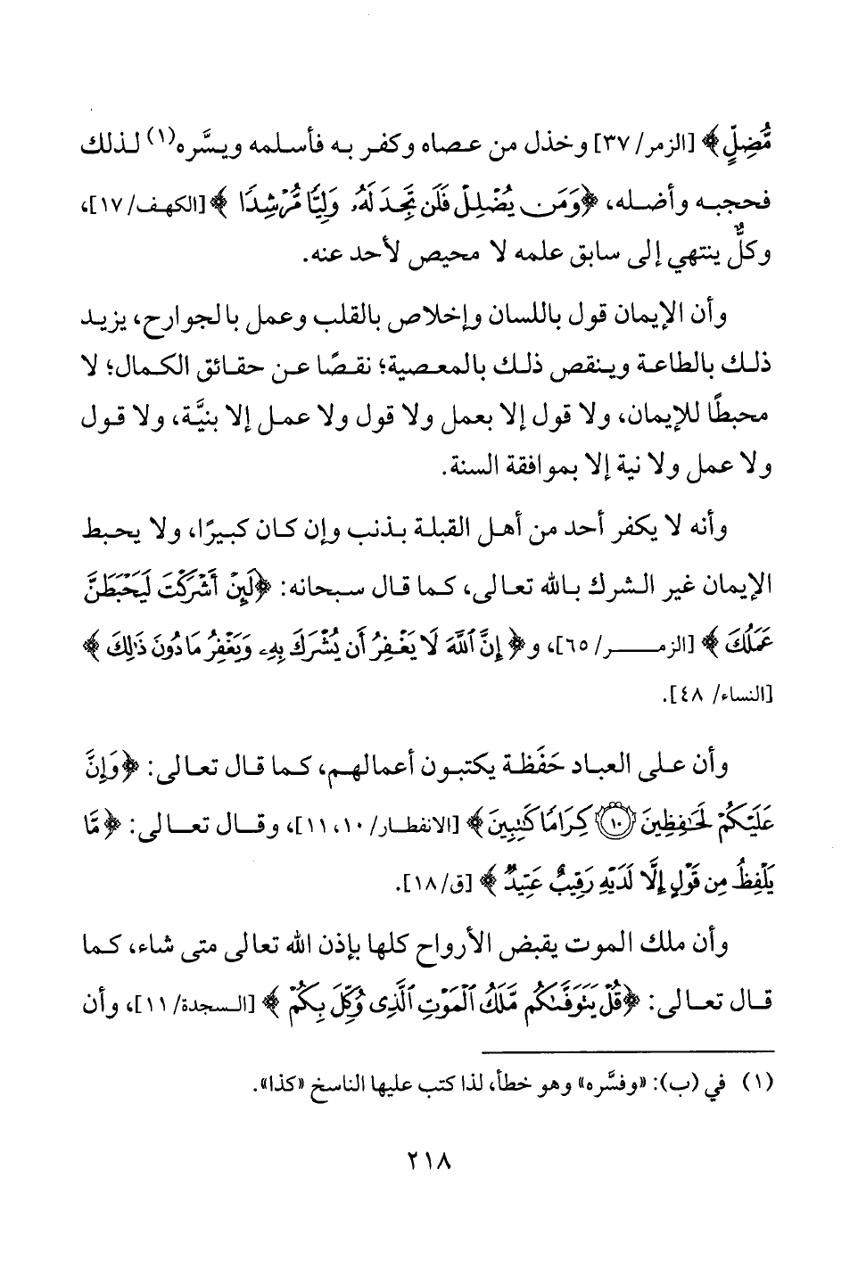 وأنه لا يكفر أحد من أهل القبلة بذنب وإن كان كبيرًا، ولا يحبط الإيمان غير الشرك بالله تعالى، كما قال سبحانه: {لَئِنْ أَشْرَكْتَ لَيَحْبَطَنَّ عَمَلُكَ} [الزمر: 65]، و {إِنَّ اللَّهَ لَا يَغْفِرُ أَنْ يُشْرَكَ بِهِ وَيَغْفِرُ مَا دُونَ ذَلِكَ} [النساء: 48].