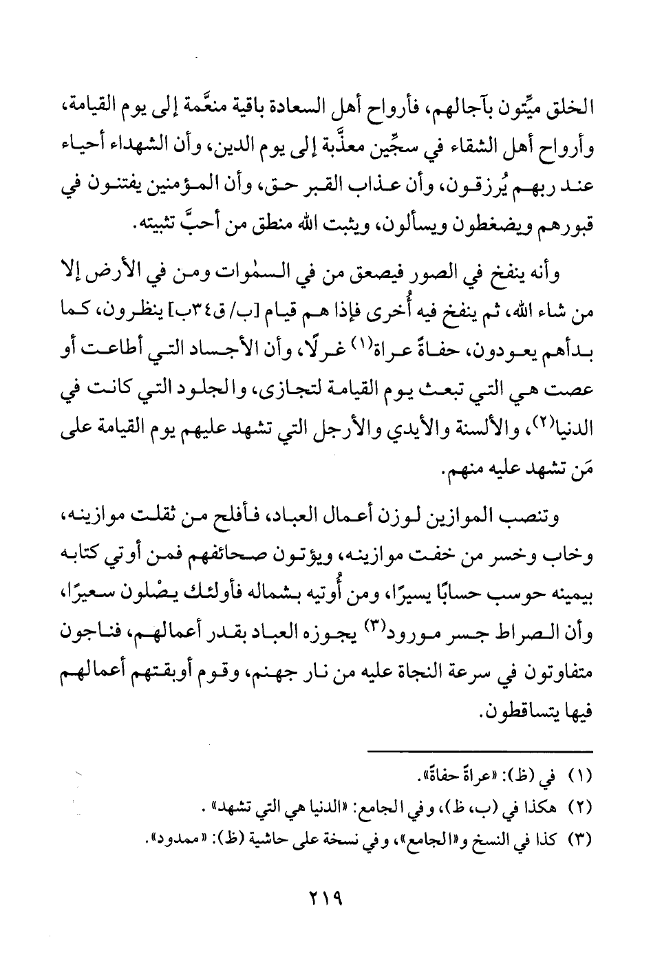 وأنه ينفخ في الصور فيصعق من في السموات ومن في الأرض إلا من شاء الله، ثم ينفخ فيه أُخرى فإذا هم قيام [ب/ ق 34 ب] ينظرون، كما بدأهم يعودون، حفاةً عراة (¬1) غرلًا، وأن الأجساد التي أطاعت أو عصت هي التي تبعث يوم القيامة لتجازى، والجلود التي كانت في الدنيا (¬2)، والألسنة والأيدي والأرجل التي تشهد عليهم يوم القيامة على مَن تشهد عليه منهم.