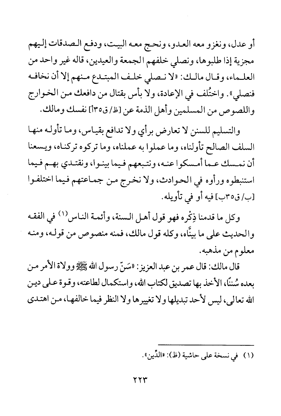 قال مالك: قال عمر بن عبد العزيز: "سَنّ رسول الله - صلى الله عليه وسلم - وولاة الأمر من بعده سُننًا، الأخذ بها تصديق لكتاب الله، واستكمال لطاعته، وقوة على دين الله تعالى، ليس لأحد تبديلها ولا تغييرها ولا النظر فيما خالفها، من اهتدى