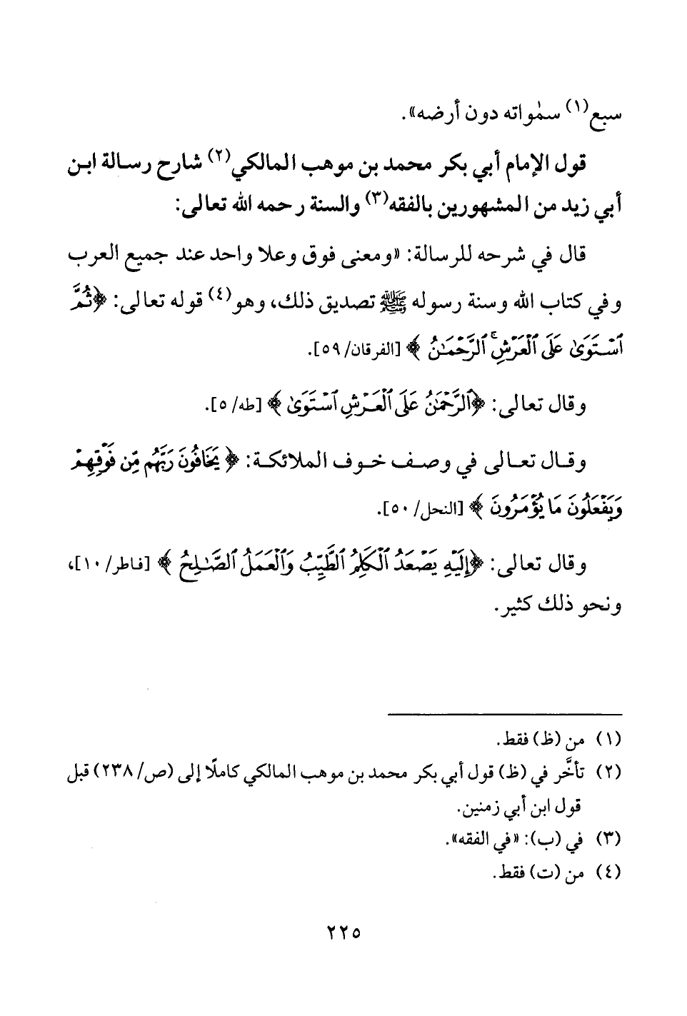 قال في شرحه للرسالة: "ومعنى فوق وعلا واحد عند جميع العرب وفي كتاب الله وسنة رسوله - صلى الله عليه وسلم - تصديق ذلك، وهو (¬4) قوله تعالى: {ثُمَّ اسْتَوَى عَلَى الْعَرْشِ الرَّحْمَنُ} [الفرقان: 59].
