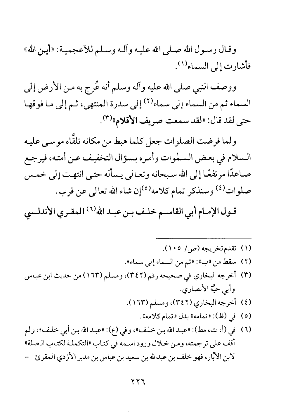 ووصف النبي صلى الله عليه وآله وسلم أنه عُرج به من الأرض إلى السماء ثم من السماء إلى سماء (¬2) إلى سدرة المنتهى، ثم إلى ما فوقها حتى لقد قال: "لقد سمعت صريف الأقلام" (¬3).
