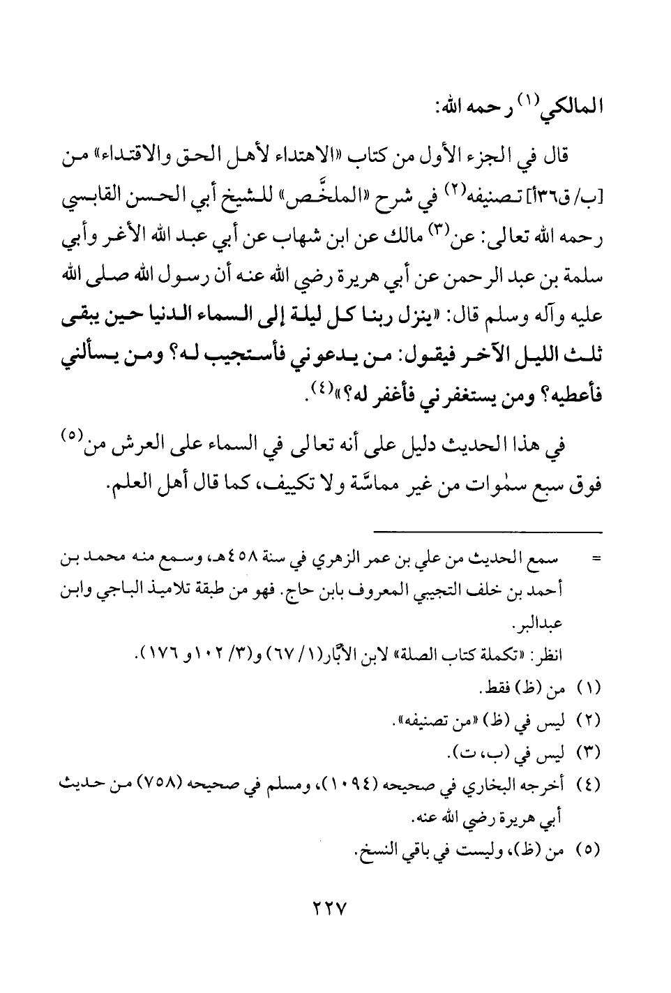 قال في الجزء الأول من كتاب "الاهتداء لأهل الحق والاقتداء" من [ب/ ق 36 أ] تصنيفه (¬2) في شرح "الملخَّص" للشيخ أبي الحسن القابسي رحمه الله تعالى: عن (¬3) مالك عن ابن شهاب عن أبي عبد الله الأغر وأبي سلمة بن عبد الرحمن عن أبي هريرة رضي الله عنه أن رسول الله صلى الله عليه وآله وسلم قال: "ينزل ربنا كل ليلة إلى السماء الدنيا حين يبقى ثلث الليل الآخر فيقول: من يدعوني فأستجيب له؟ ومن يسألني فأعطيه؟ ومن يستغفرني فأغفر له؟ " (¬4).