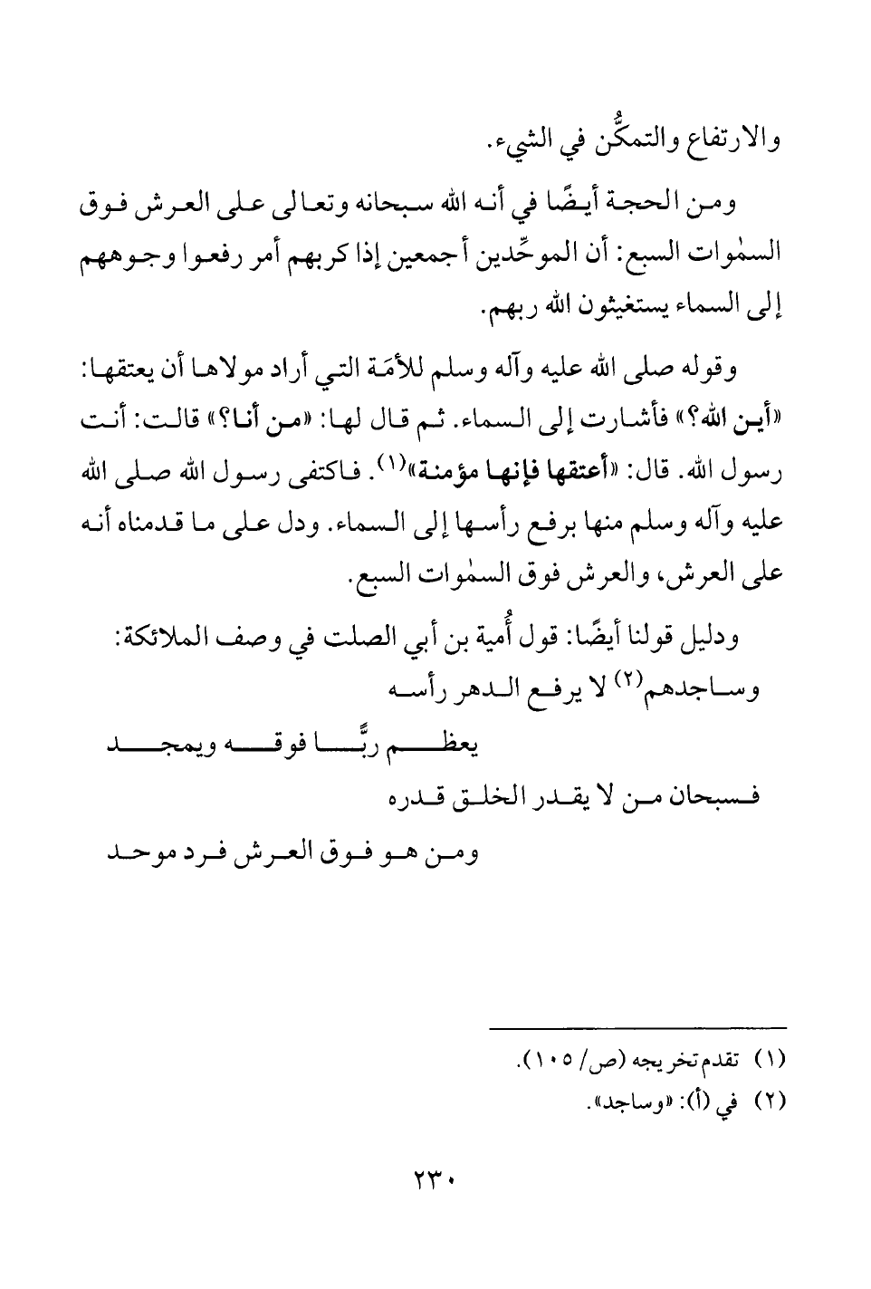 وقوله صلى الله عليه وآله وسلم للأمَة التي أراد مولاها أن يعتقها: "أين الله؟ " فأشارت إلى السماء. ثم قال لها: "من أنا؟ " قالت: أنت رسول الله. قال: "أعتقها فإنها مؤمنة" (¬1). فاكتفى رسول الله صلى الله عليه وآله وسلم منها برفع رأسها إلى السماء. ودل على ما قدمناه أنه على العرش، والعرش فوق السموات السبع.