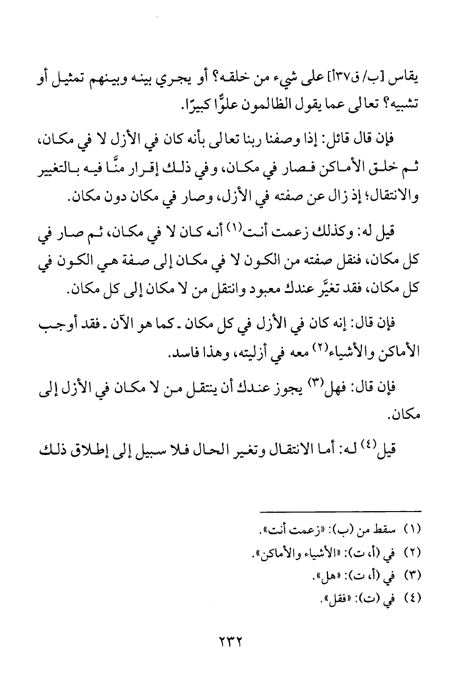 فإن قال قائل: إذا وصفنا ربنا تعالى بأنه كان في الأزل لا في مكان، ثم خلق الأماكن فصار في مكان، وفي ذلك إقرار منَّا فيه بالتغيير والانتقال؛ إذ زال عن صفته في الأزل، وصار في مكان دون مكان.