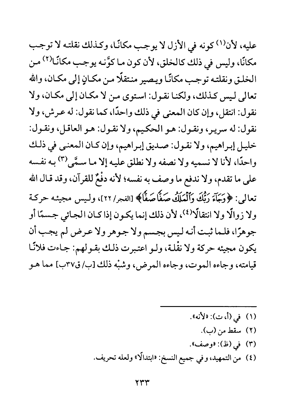 عليه، لأن (¬1) كونه في الأزل لا يوجب مكانًا، وكذلك نقلته لا توجب مكانًا، وليس في ذلك كالخلق، لأن كون ما كوَّنه يوجب مكانًا (¬2) من الخلق ونقلته توجب مكانًا ويصير منتقلًا من مكانٍ إلى مكان، والله تعالى ليس كذلك، ولكنا نقول: استوى من لا مكان إلى مكان، ولا نقول: انتقل، وإن كان المعنى في ذلك واحدًا، كما نقول: له عرش، ولا نقول: له سرير، ونقول: هو الحكيم، ولا نقول: هو العاقل، ونقول: خليل إبراهيم، ولا نقول: صديق إبراهيم، وإن كان المعنى في ذلك واحدًا، لأنا لا نسميه ولا نصفه ولا نطلق عليه إلا ما سمَّى (¬3) به نفسه على ما تقدم، ولا ندفع ما وصف به نفسه؛ لأنه دفْعٌ للقرآن، وقد قال الله تعالى: {وَجَاءَ رَبُّكَ وَالْمَلَكُ صَفًّا صَفًّا} [الفجر: 22]، وليس مجيئه حركة ولا زوالًا ولا انتقالًا (¬4)، لأن ذلك إنما يكون إذا كان الجائي جسمًا أو جوهرًا، فلما ثبت أنه ليس بجسم ولا جوهر ولا عرض لم يجب أن يكون مجيئه حركة ولا نقْلة، ولو اعتبرت ذلك بقولهم: جاءت فلانًا قيامته، وجاءه الموت، وجاءه المرض، وشبْه ذلك [ب/ ق 37 ب] مما هو