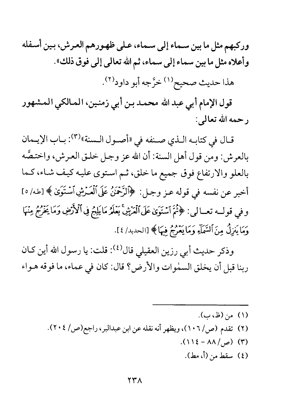 قول الإمام أبي عبد الله محمد بن أبي زمنين، المالكي المشهور رحمه الله تعالى: قال في كتابه الذي صنفه في "أصول السنة" (¬3): باب الإيمان بالعرش: ومن قول أهل السنة: أن الله عز وجل خلق العرش، واختصَّه بالعلو والارتفاع فوق جميع ما خلق، ثم استوى عليه كيف شاء، كما أخبر عن نفسه في قوله عز وجل: {الرَّحْمَنُ عَلَى الْعَرْشِ اسْتَوَى} [طه: 5] وفي قوله تعالى: {ثُمَّ اسْتَوَى عَلَى الْعَرْشِ يَعْلَمُ مَا يَلِجُ فِي الْأَرْضِ وَمَا يَخْرُجُ مِنْهَا وَمَا يَنْزِلُ مِنَ السَّمَاءِ وَمَا يَعْرُجُ فِيهَا} [الحديد: 4].