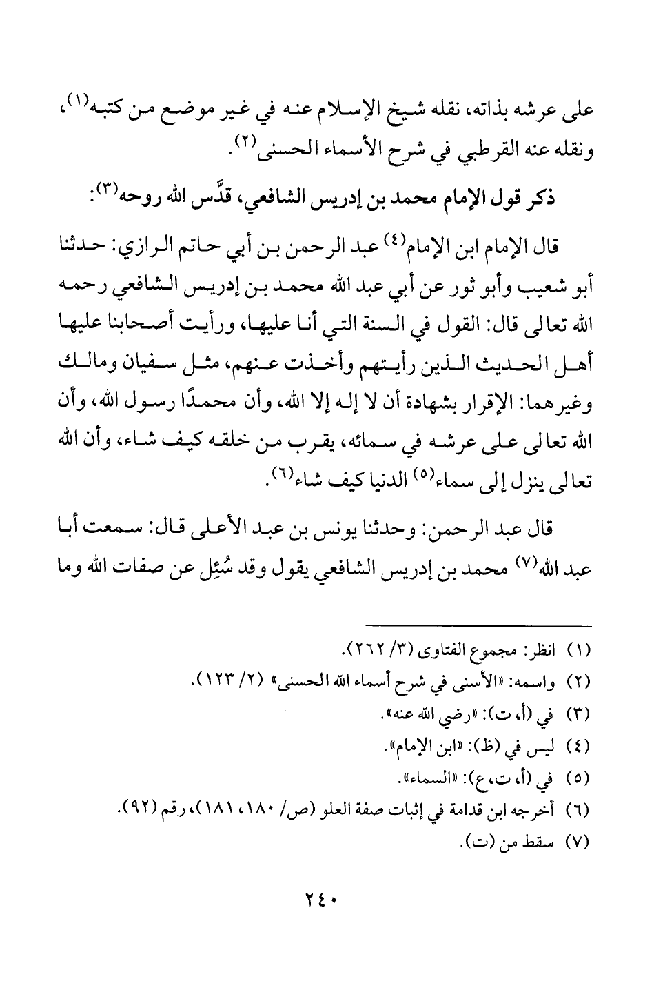 قال الإمام ابن الإمام (¬4) عبد الرحمن بن أبي حاتم الرازي: حدثنا أبو شعيب وأبو ثور عن أبي عبد الله محمد بن إدريس الشافعي رحمه الله تعالى قال: القول في السنة التي أنا عليها، ورأيت أصحابنا عليها أهل الحديث الذين رأيتهم وأخذت عنهم، مثل سفيان ومالك وغيرهما: الإقرار بشهادة أن لا إله إلا الله، وأن محمدًا رسول الله، وأن الله تعالى على عرشه في سمائه، يقرب من خلقه كيف شاء، وأن الله تعالى ينزل إلى سماء (¬5) الدنيا كيف شاء (¬6).