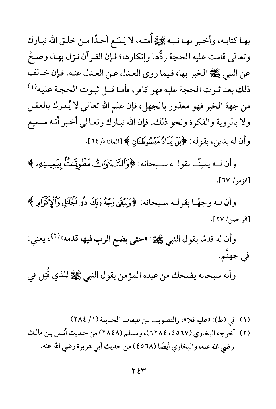 وأن له قدمًا بقول النبي - صلى الله عليه وسلم -: "حتى يضع الرب فيها قدمه" (¬2)، يعني: في جهنَّم.