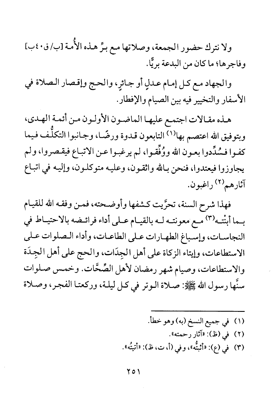 ولا نترك حضور الجمعة، وصلاتها مع برِّ هذه الأُمة [ب/ ق 40 ب] وفاجرها؛ ما كان من البدعة بريًّا.