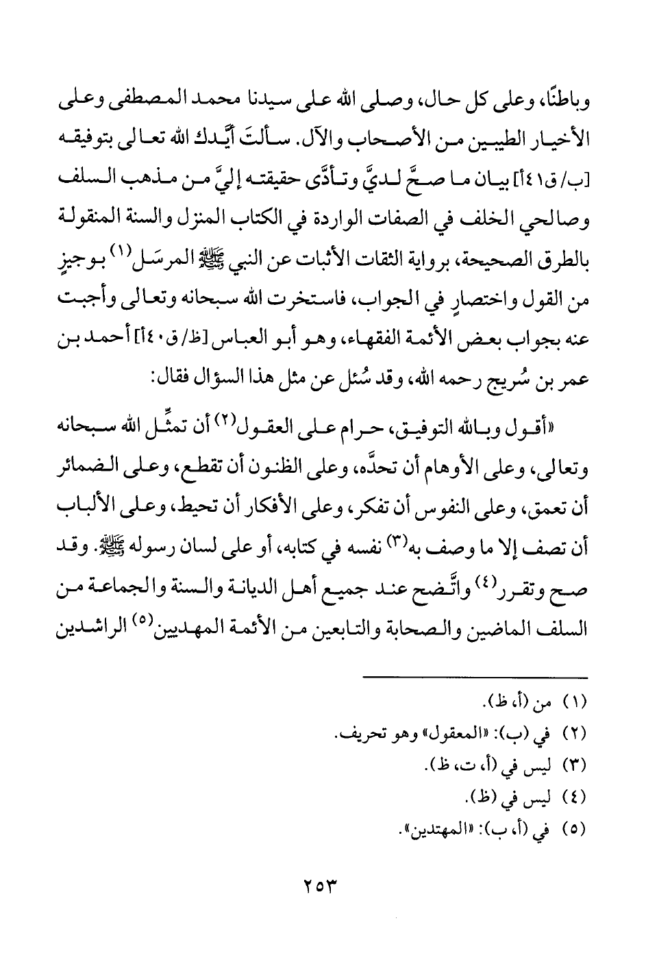 وباطنًا، وعلى كل حال، وصلى الله على سيدنا محمد المصطفى وعلى الأخيار الطيبين من الأصحاب والآل. سألتَ إيَّدك الله تعالى بتوفيقه [ب/ ق 41 أ] بيان ما صحَّ لديَّ وتأدَّى حقيقته إليَّ من مذهب السلف وصالحي الخلف في الصفات الواردة في الكتاب المنزل والسنة المنقولة بالطرق الصحيحة، برواية الثقات الأثبات عن النبي - صلى الله عليه وسلم - المرسَل (¬1) بوجيزٍ من القول واختصارٍ في الجواب، فاستخرت الله سبحانه وتعالى وأجبت عنه بجواب بعض الأئمة الفقهاء، وهو أبو العباس [ظ/ ق 40 أ] أحمد بن عمر بن سُريج رحمه الله، وقد سُئل عن مثل هذا السؤال فقال: