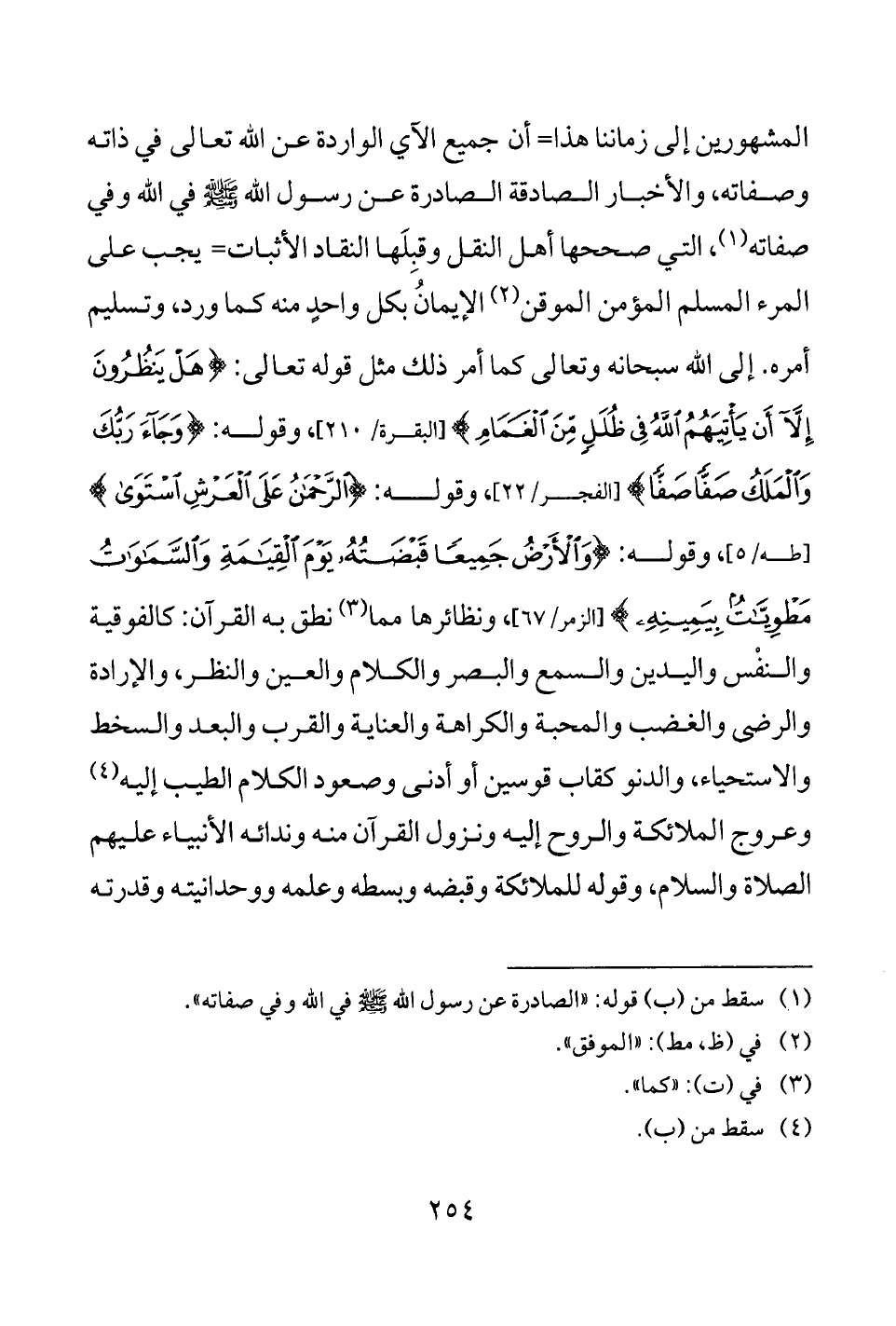 المشهورين إلى زماننا هذا = أن جميع الآي الواردة عن الله تعالى في ذاته وصفاته، والأخبار الصادقة الصادرة عن رسول الله - صلى الله عليه وسلم - في الله وفي صفاته (¬1)، التي صححها أهل النقل وقبِلَها النقاد الأثبات = يجب على المرء المسلم المؤمن الموقن (¬2) الإيمانُ بكل واحدٍ منه كما ورد، وتسليم أمره. إلى الله سبحانه وتعالى كما أمر ذلك مثل قوله تعالى {هَلْ يَنْظُرُونَ إِلَّا أَنْ يَأْتِيَهُمُ اللَّهُ فِي ظُلَلٍ مِنَ الْغَمَامِ} [البقرة: 210]، وقوله: {وَجَاءَ رَبُّكَ وَالْمَلَكُ صَفًّا صَفًّا} [الفجر: 22]، وقوله: {الرَّحْمَنُ عَلَى الْعَرْشِ اسْتَوَى} [طه: 5]، وقوله: {وَالْأَرْضُ جَمِيعًا قَبْضَتُهُ يَوْمَ الْقِيَامَةِ وَالسَّمَاوَاتُ مَطْوِيَّاتٌ بِيَمِينِهِ} [الزمر: 67]، ونظائرها مما (¬3) نطق به القرآن: كالفوقية والنفْس واليدين والسمع والبصر والكلام والعين والنظر، والإرادة والرضى والغضب والمحبة والكراهة والعناية والقرب والبعد والسخط والاستحياء، والدنو كقاب قوسين أو أدنى وصعود الكلام الطيب إليه (¬4) وعروج الملائكة والروح إليه ونزول القرآن منه وندائه الأنبياء عليهم الصلاة والسلام، وقوله للملائكة وقبضه وبسطه وعلمه ووحدانيته وقدرته