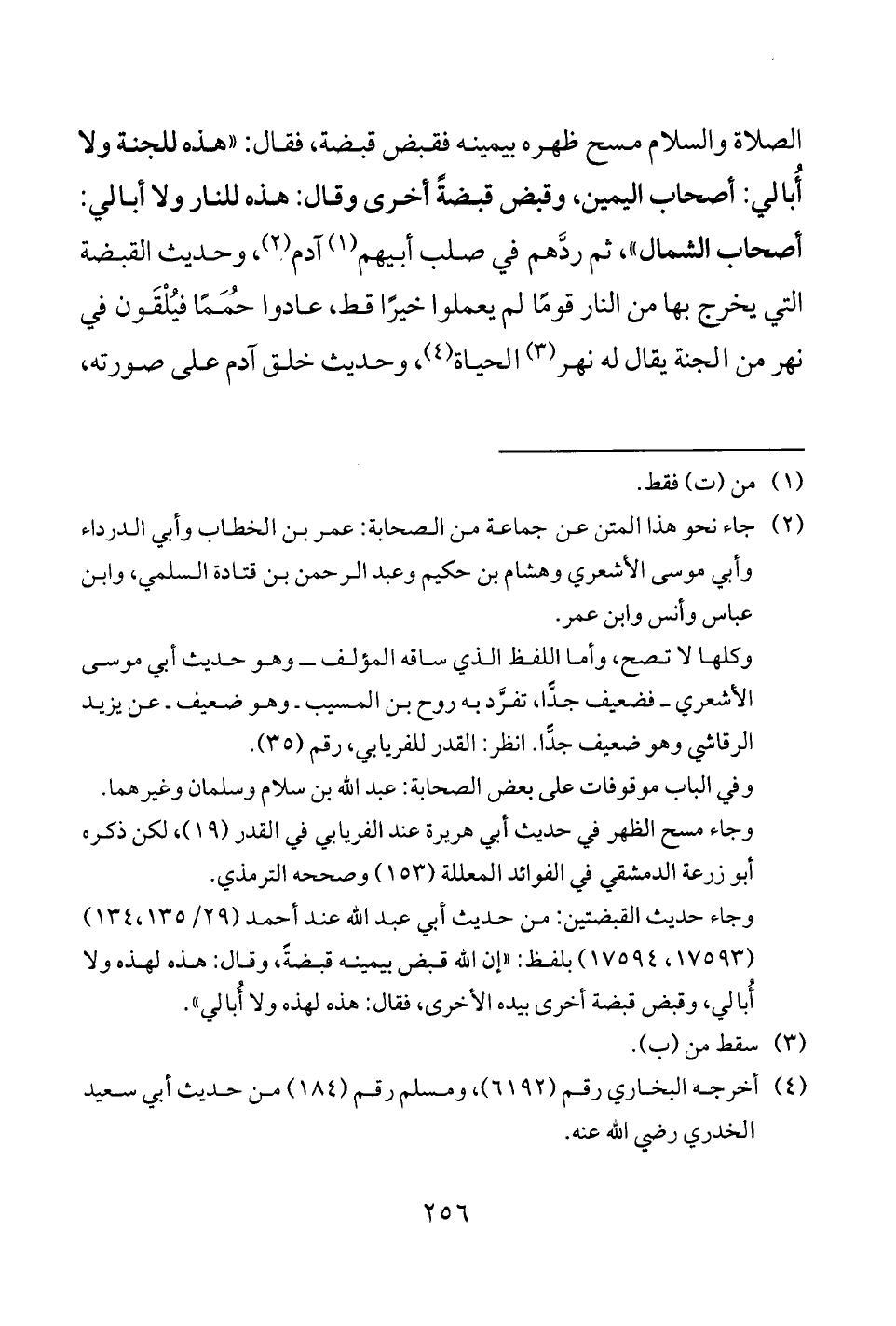 الصلاة والسلام مسح ظهره بيمينه فقبض قبضة، فقال: "هذه للجنة ولا أُبالي: أصحاب اليمين، وقبض قبضةً أخرى وقال: هذه للنار ولا أُبالي: أصحاب الشمال"، ثم ردَّهم في صلب أبيهم (¬1) آدم (¬2)، وحديث القبضة التي يخرج بها من النار قومًا لم يعملوا خيرًا قط، عادوا حُمَمًا فيُلْقَون في نهر من الجنة يقال له نهر (¬3) الحياة (¬4)، وحديث خلق آدم على صورته،