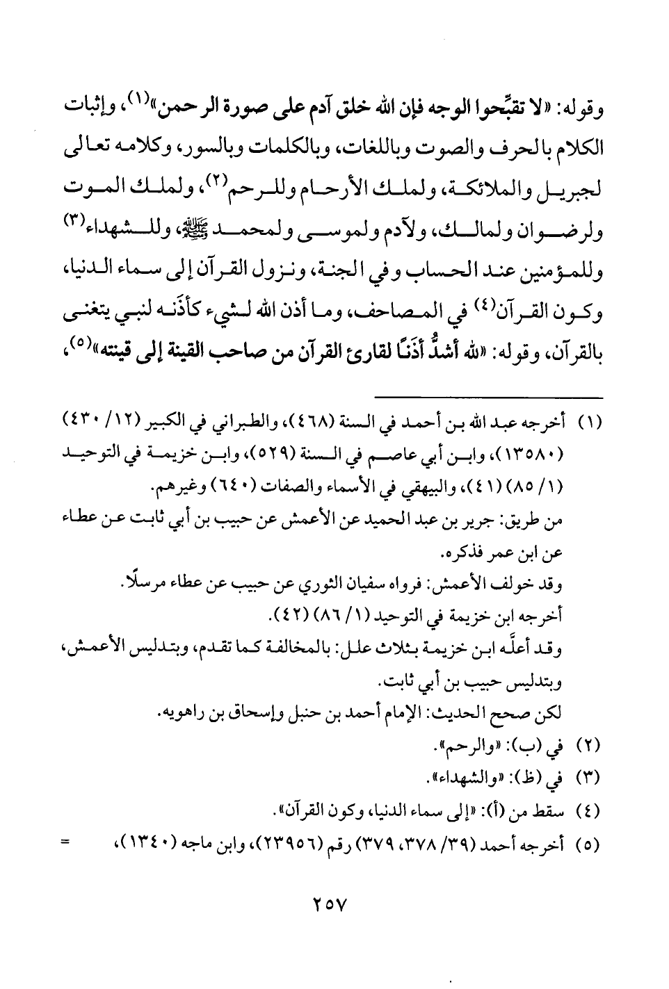 وقوله: "لا تقبِّحوا الوجه فإن الله خلق آدم على صورة الرحمن" (¬1)، وإثبات الكلام بالحرف والصوت وباللغات، وبالكلمات وبالسور، وكلامه تعالى لجبريل والملائكة، ولملك الأرحام وللرحم (¬2)، ولملك الموت ولرضوان ولمالك، ولآدم ولموسى ولمحمد - صلى الله عليه وسلم -، وللشهداء (¬3) وللمؤمنين عند الحساب وفي الجنة، ونزول القرآن إلى سماء الدنيا، وكون القرآن (¬4) في المصاحف، وما أذن الله لشيء كأذَنه لنبي يتغنى بالقرآن، وقوله: "لله أشدُّ أذَنًا لقارئ القرآن من صاحب القينة إلى قينته" (¬5)،